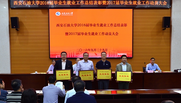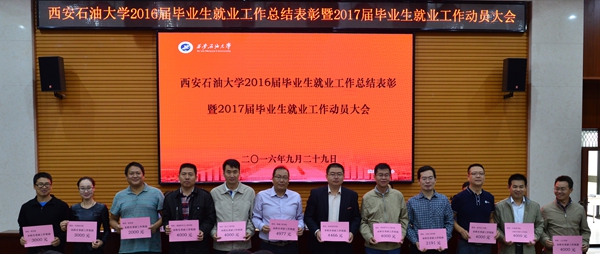 学生工作处处长、就业指导中心主任王宏卫发布了《beat365英国官方网站2016届毕业生就业工作年度报告》,印发了新修订的《beat365英国官方网站毕业生就业工作考评奖励办法》(西石大生[2016]171号)。机械工程学院副院长陈子恒、计算机学院辅导员路婷以及石油工程学院辅导员张欢分别代表先进集体、先进个人和2017届毕业生辅导员作了发言。