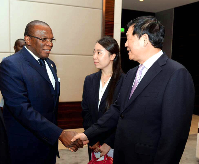 陕西省委书记娄勤俭与几内亚总统府国务部长兼总统投资事务顾问易卜拉欣玛•卡索里•弗法纳亲切握手