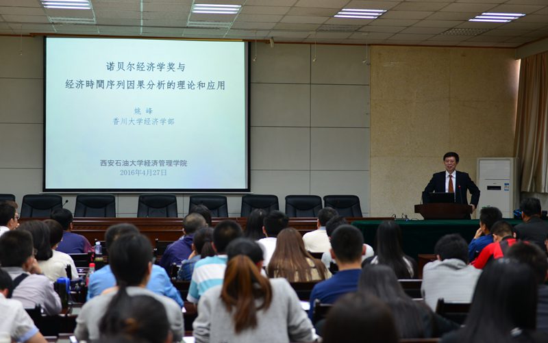 随后,姚峰教授在第三会议室为beat365师生作了题为《诺贝尔经济学奖与经济时间序列因果分析的理论和应用》的学术报告。