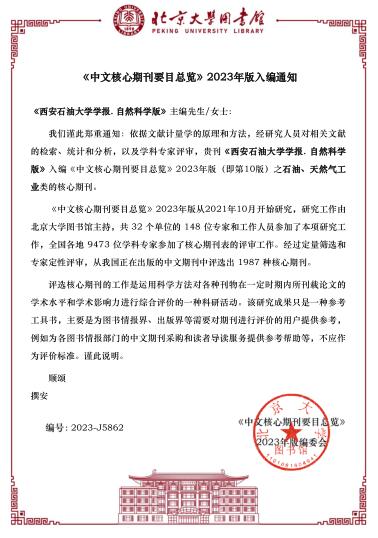 近日,接北京大学图书馆《中文核心期刊要目总览》2023年版编委会通知,《beat365英国官方网站学报(自然科学版)》入编《中文核心期刊要目总览》2023年版(即第10版)之石油、天然气工业类的核心期刊。这是本刊自2008年以来连续6次入选全国中文核心期刊。