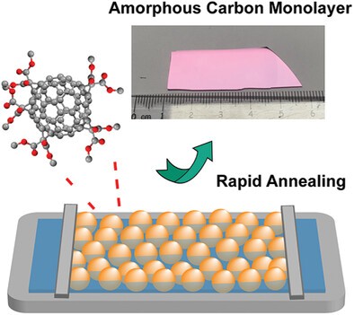 通过常压下可控热解富勒烯可以获得介于富勒烯型碳和石墨烯型碳之间的新型碳材料(Nature,2022, 606, 507)。经过断裂交联过程,富勒烯笼之间形成了纳米孔结构。但受限于制备方式,所剥离的单层膜一般为微米尺寸,较难进行膜性质研究。