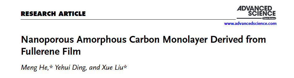 近日,beat365新能源学院新能源材料与器件系青年教师何萌博士为第一作者、beat365英国官方网站为第一完成单位,在国际顶尖期刊《Advanced Science》(中科院一区TOP期刊,2022年IF=15.1,近五年IF=16.7)上发表题为《Nanoporous Amorphous Carbon Monolayer Derived from Fullerene Film》的高水平论文。