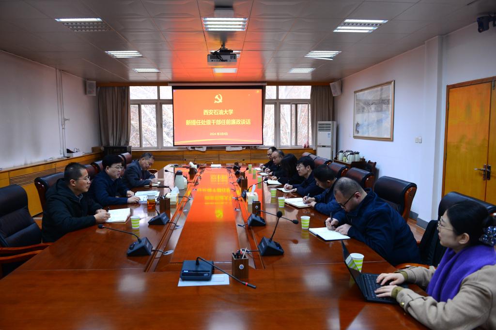 3月4日上午,校党委副书记、纪委书记、监察专员王辉强在雁塔校区行政楼五楼会议室与新提任处级干部开展集体廉政谈话。会议由校纪委副书记齐仲锋主持。