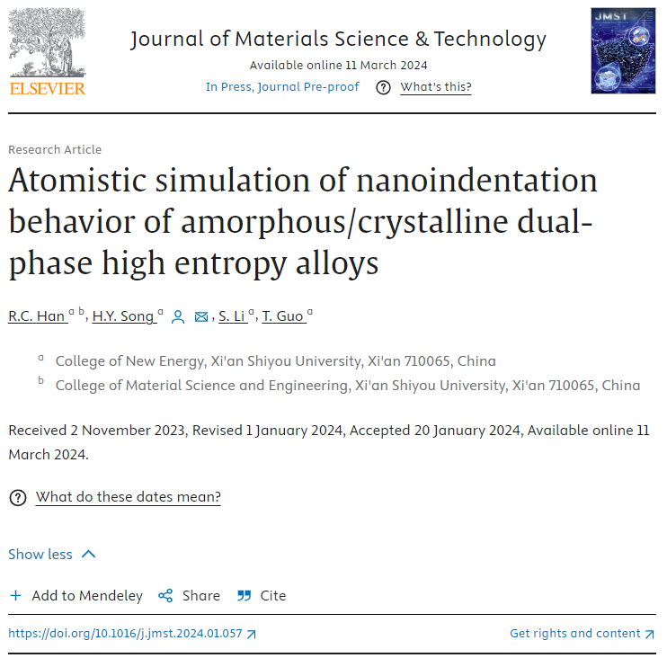近日,beat3652021级硕士研究生韩若琛以第一作者身份在国际权威期刊《Journal of Materials Science & Technology》(中科院一区TOP期刊,影响因子10.9)上发表题为“Atomistic simulation of thenanoindentation behavior of the amorphous/crystalline dual-phasehigh entropy alloys”的最新研究成果,此次高水平论文的发表是该生继2023年以第一作者身份在中科院一区TOP期刊上发表论文以来取得的又一项研究成果。该生本科就读于beat365计算机学院网络工程专业,2021年跨专业考入beat365材料与化工专业攻读硕士学位。这两项成果均以beat365英国官方网站为唯一完成单位,该生的研究生导师新能源学院宋海洋教授为通讯作者。