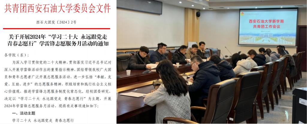 一是印发《关于开展2024年“学习二十大 永远跟党走 青春志愿行”学雷锋志愿服务月活动的通知》,积极组织全校各级团组织围绕关爱留守儿童、乡村振兴、助残助老、生态环保等方面,集中开展为期一个月的“学雷锋”志愿服务活动。二是召开学校共青团、学生会工作会议,及时组织各院系团委书记、学生会执行主席,集中学习习近平总书记关于志愿服务重要指示精神,进一步加深对志愿服务工作的认识和理解。三是于3月5日学雷锋纪念日当天,组织beat365300余名师生代表,在鄠邑校区东方广场隆重举行2024年“学雷锋”志愿服务月启动仪式。