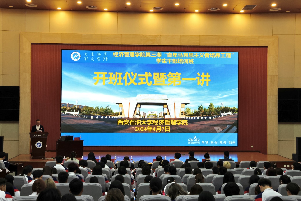 为深入学习贯彻习近平新时代中国特色社会主义思想和党的二十大精神,提高青年学生的马克思主义理论素养和实践能力,引领广大青年做有理想、敢担当、能吃苦、肯奋斗的新时代好青年,4月7日晚,经济管理学院第三期“青年马克思主义者培养工程”学生干部培训班开班仪式暨第一讲在鄠邑校区弘石学术报告厅顺利举办。校党委副书记张木出席开班仪式并作专题辅导报告。经济管理学院党委书记谈建勤,全体学生工作干部以及学生干部400余人参加培训班开班仪式暨第一讲。开班仪式由经济管理学院党委副书记王刚主持。