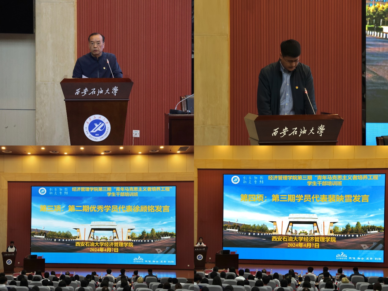 谈建勤在总结时指出,广大青年学生干部应当发挥先锋作用,践行铁人精神,汲取前进力量,努力做党的事业的忠诚拥护者和坚定实践者。他希望与会学生干部要仰望星空、脚踏实地,向善向上、阳光自信,勇立潮头、勇争第一。学院团委书记李博文宣读了本期培训班的培训通知及考核要求,学院第二期培训班优秀学员代表徐顾铭与第三期培训班学员代表裴映雪分别发言。