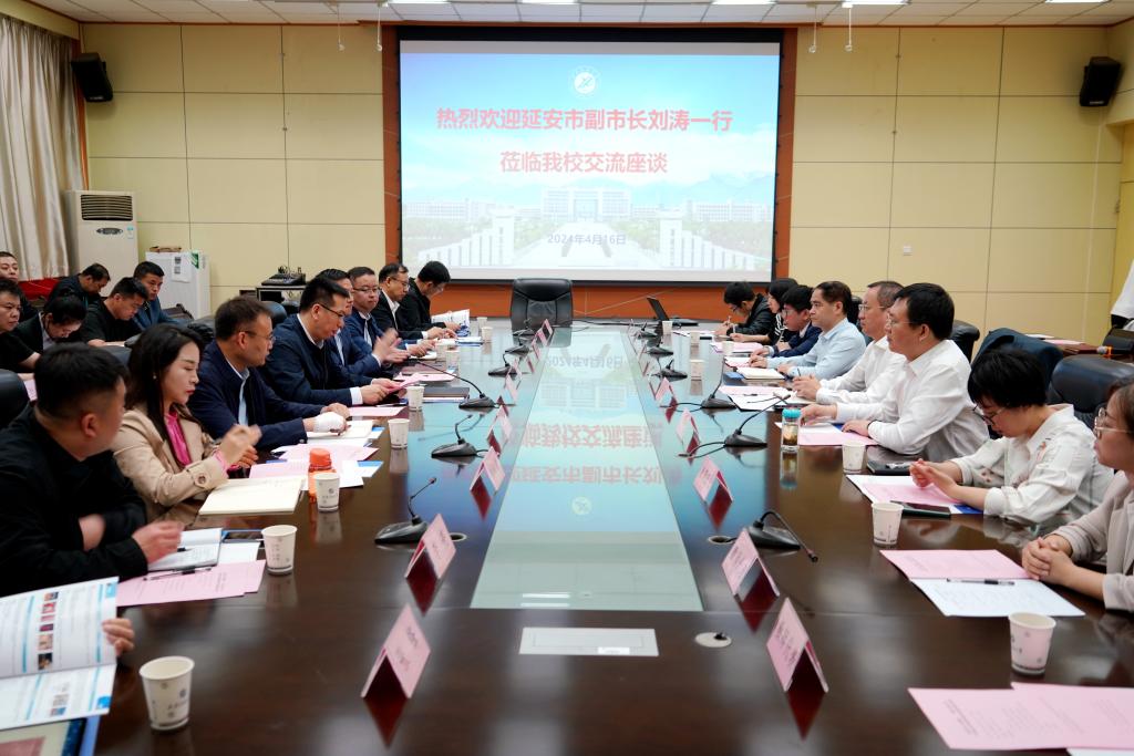 4月16日上午,延安市副市长刘涛一行来beat365开展产学研合作和成果转化交流座谈。会议在雁塔校区会议中心第一会议室召开,beat365副校长张荣军出席座谈会,科研处处长张益主持会议。