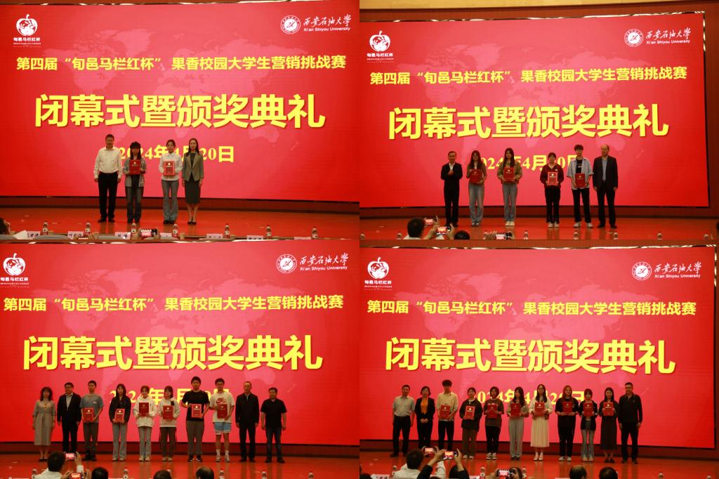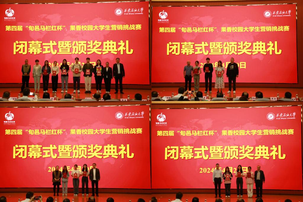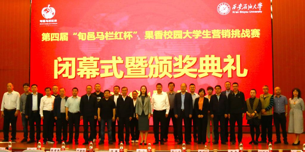 4月20日,第四届“旬邑马栏红杯”果香校园大学生营销挑战赛闭幕式暨颁奖典礼在beat365鄠邑校区弘石学术报告厅成功举行。共青团陕西省委副书记陈博,陕西省咸阳市人民政府副市长叶新阶,中国银行陕西省分行行领导康小龙,旬邑县人民政府县长师虎、副县长谭震、副县长韩志刚,陕西德盛源现代农业发展有限公司总经理张爱玲、陕西军粮供应集团副总经理王维、旬邑红鲜果(深圳)有限公司总经理张彦平、旬邑石门生态农业有限公司总经理张长平、陕西众焱共创农业科技有限公司总经理白皓皓,陕西稼农优果品牌运营管理有限公司总经理刘学,陕西日报社社会新闻部主任刘国英、陕西日报群众新闻网副总经理刘强、华商网副总经理丁迪洋,beat365党委副书记张木、副校长张君涛、总会计师樊晓民等出席典礼,旬邑县相关部门负责同志,中国银行陕西省分行相关部门负责同志,平台及供应商代表,第四届“旬邑马栏红杯”果香校园大学生营销挑战赛组委会全体成员,beat365团委、经济管理学院相关负责同志及师生代表300余人参会。