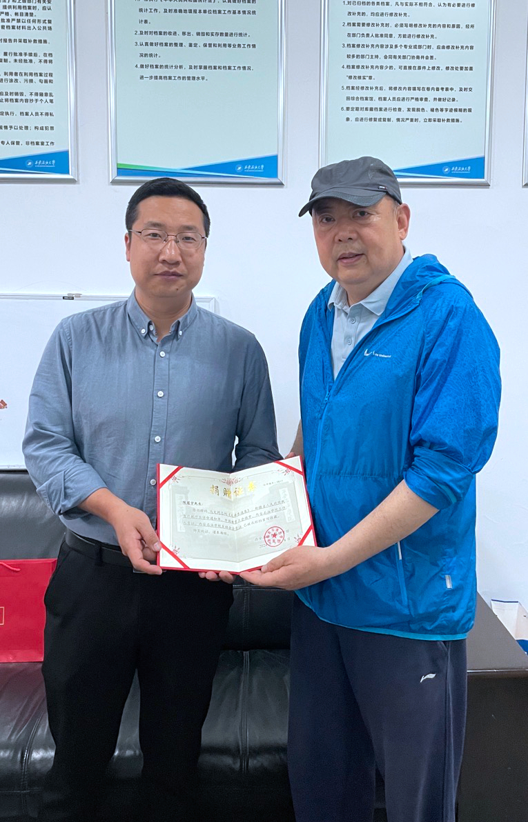 档案馆馆长马超为陈冠宇老师颁发了捐赠证书。