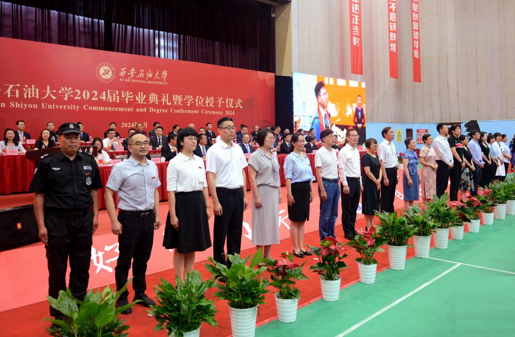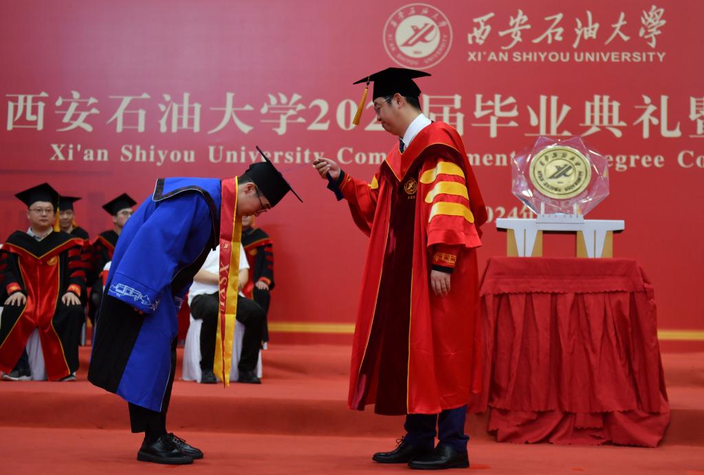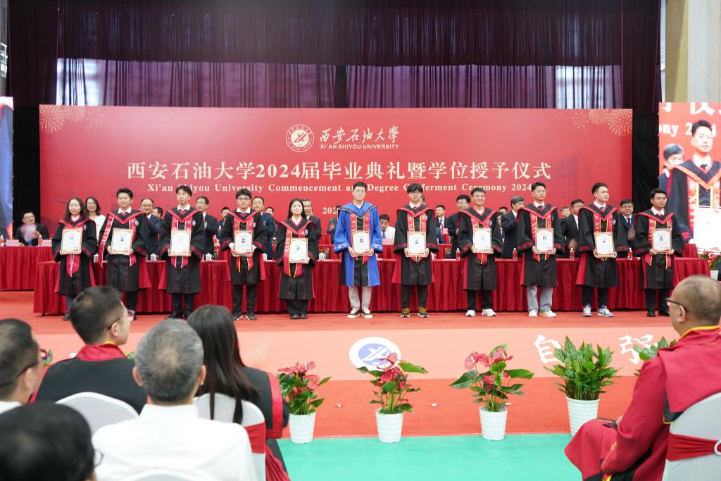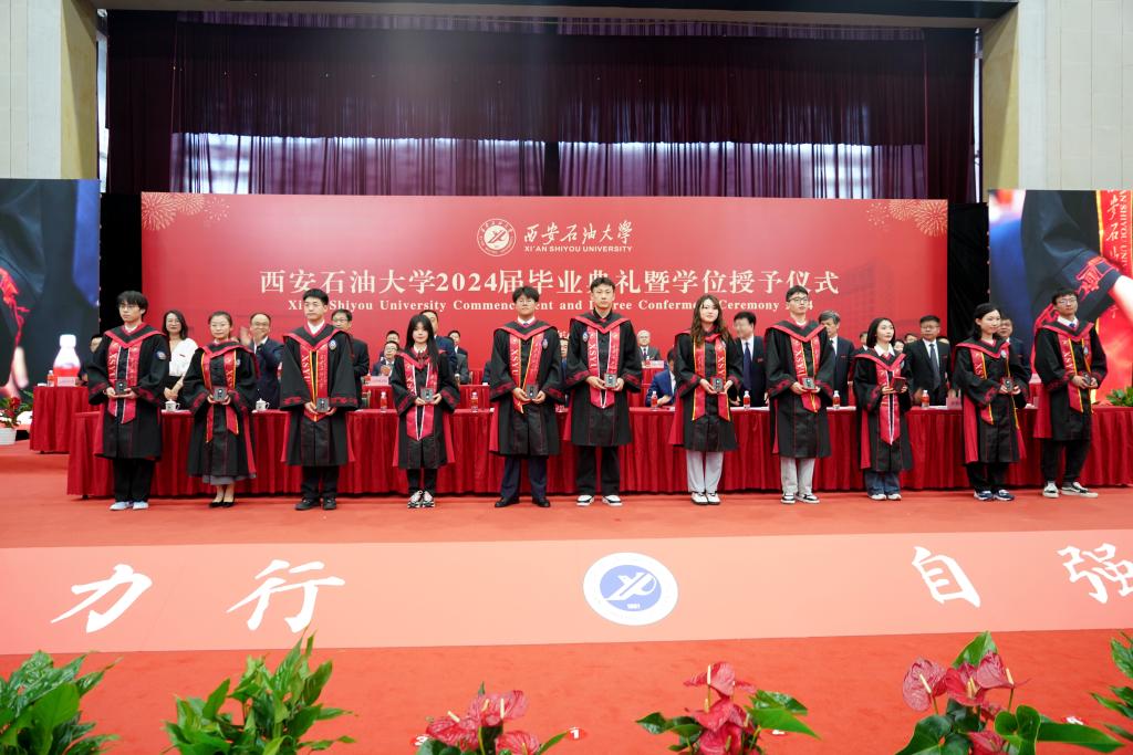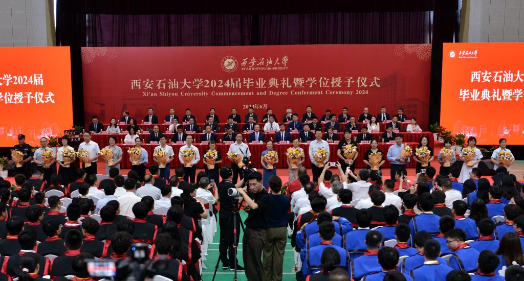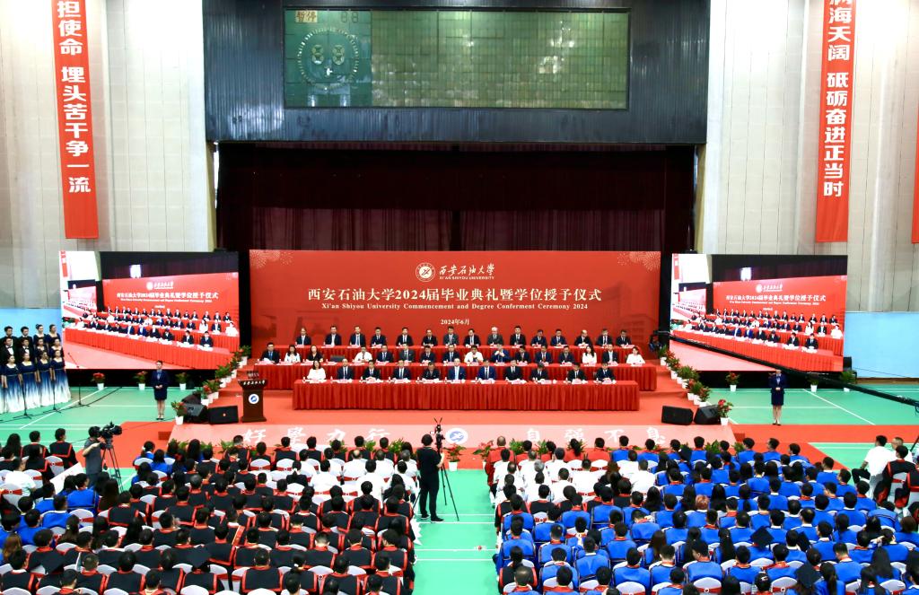 校长王进富为2024届毕业生致辞。他代表学校用这场隆重的毕业典礼、精心设计的专属学位服,向2024届5705名圆满完成学业、取得学位的优秀学子表达爱与祝福、感谢与期待;向春风化雨、寸草春晖的老师、父母们以及18万校友们表示最衷心的感谢和最崇高的敬意。王进富以《远观、问道、登顶》为题,嘱托勉励毕业生:一是作为新时代青年,要用开阔的视野远观伟大的征程,用新时代的历史方位调整自己的人生航向,披荆斩棘、乘风破浪。在伟大的时代坚定奋斗的信念,在实践锻造中不断增强做中国人的志气、骨气和底气,不畏艰难,无畏风雨,用“我为祖国献石油”的铮铮誓言为人生定义,在青春的赛道上创造无愧于党、无愧于人民、无愧于时代的新业绩;二是新征程上,要追寻求是之道,善于运用马克思主义的显微镜和望远镜观察社会、观察世界,认真研究事物内在联系,准确把握事物发展规律,拨开现象、察看本质,作一名洞察世事、清醒睿智的人。直面问道能源勘探开采主战场,开拓能源开发利用新阵地,探索创新之道,以创新精神发现“好油藏”、开展“新勘探”,实现“真开采”,保障“优储运”,做到“精炼化”,为服务国家能源战略贡献西石大智慧和西石大力量。三是登顶的路上,要坚持不懈,做一个坚定的行动派,跑出自己的加速度,为实现人生理想勇敢攀登,让青春在创新创造中闪闪发光;要追求卓越,不断学习、不断进步,不断追求、不断攀登,永葆热爱、怀揣梦想,行而不辍、履践致远,努力成为更好的自己,努力建设更好的中国。最后王进富寄语广大毕业生永葆赤诚之心,常怀感恩之心,胸藏悲悯之心,昂扬奋进之心,赓续红色血脉,弘扬铁人精神,望向曙光,奔向辉煌!