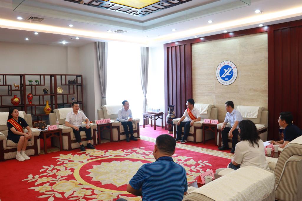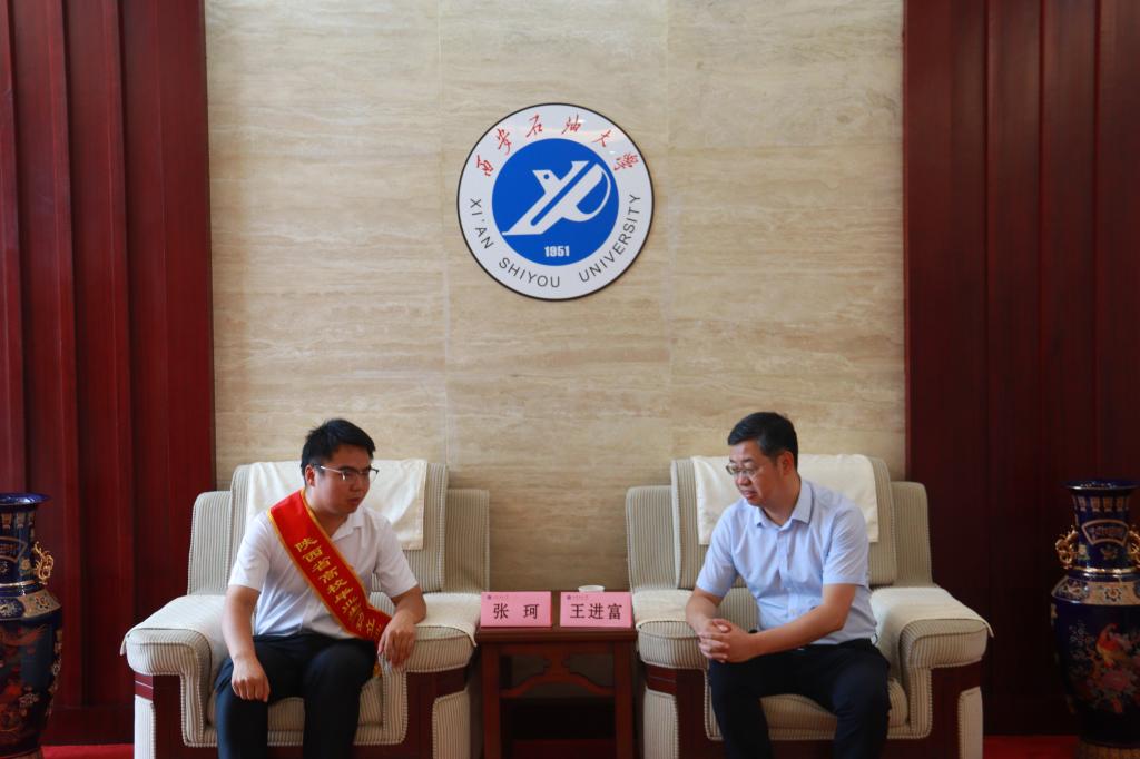 会前,校长王进富亲切会见了报告团一行。王进富对5位优秀毕业生代表来校作报告表示欢迎和感谢,对他们扎根基层、报效祖国、服务人民的先进事迹表示赞扬与肯定。他指出,毕业生建功立业先进事迹报告活动的举办,就是以先进榜样为力量,引领广大学生树立正确的学习观、就业观和人生观,立志做有理想、敢担当、能吃苦、肯奋斗的新时代好青年。他表示,学校将以此次分享会为契机,充分挖掘学校优秀校友先进事迹,引导广大同学向身边的榜样和先进看齐,赓续红色血脉,弘扬铁人精神,在新时代的广阔天地绽放青春之花,同时也希望校友张珂(beat365石工院2019届本科毕业生)能够一如既往地支持母校发展。