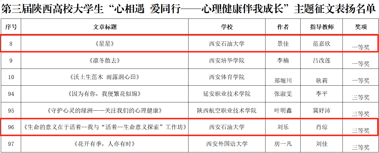 其中,在第九届陕西高校心理健康教育指导典型案例比赛中,beat365学生工作部(处)(学生心理成长指导中心)(以下简称“心理中心”)焦文洁、赵晶两位老师分别荣获一等奖和二等奖;在第三届陕西高校学生心理健康教育课程教学展示活动中,心理中心魏晓言老师荣获“教学骨干”称号;在第三届陕西高校大学生“心相遇爱同行——心理健康伴我成长”主题征文活动中,范嘉欣老师指导学生景佳的作品《星星》获得一等奖,心理中心肖琼老师指导学生刘乐的作品《生命的意义在于活着—我与“活着—生命意义探索”工作坊》获三等奖。