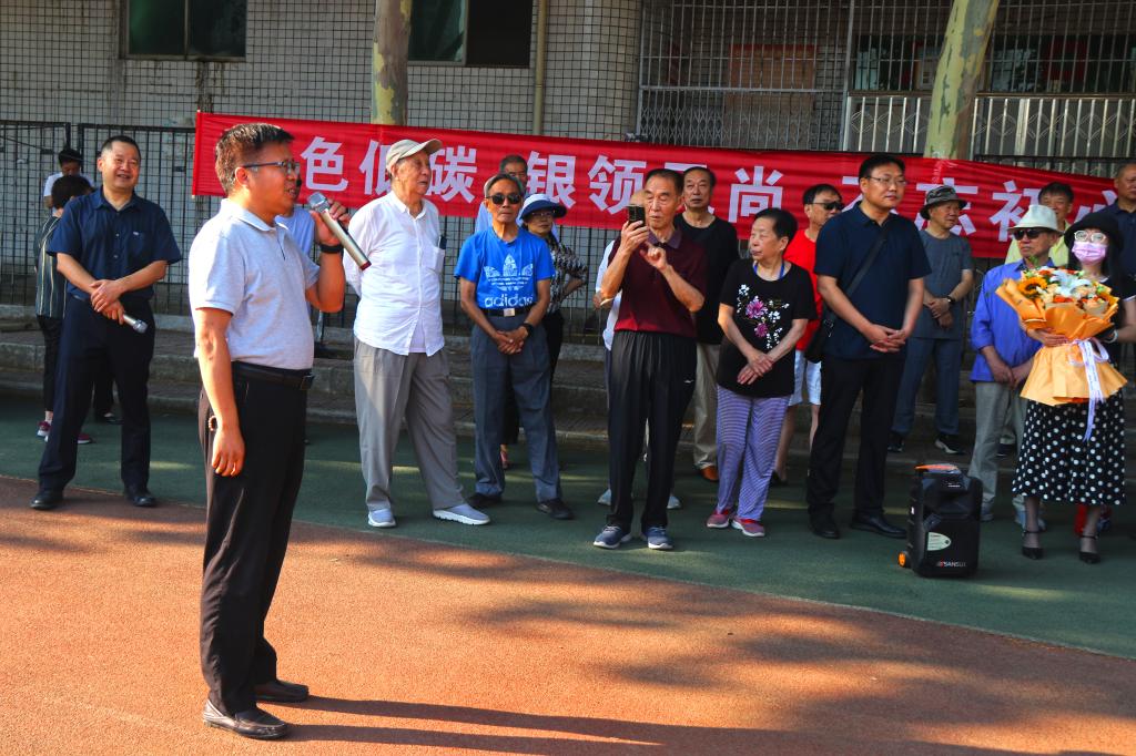 离退休党总支书记、离退休工作处处长苟金虎宣读了比赛规则。比赛规则是80周岁及以上年龄段的老同志绕田径场一周,限时10分钟以内完成。70至79周岁的老同志男、女分组,绕田径场两周,在15分钟以内完成。70周岁以下的老同志男、女分组,绕田径场三周,在20分钟内完成。