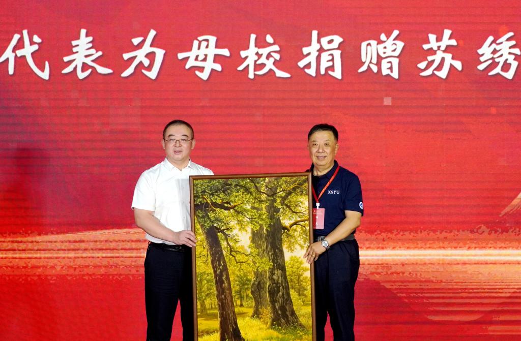 厂80级校友崔晓明为母校捐赠苏绣《三棵树》,表达对母校的祝福,常江代表学校接受捐赠,感谢80级校友对母校的深厚情谊。