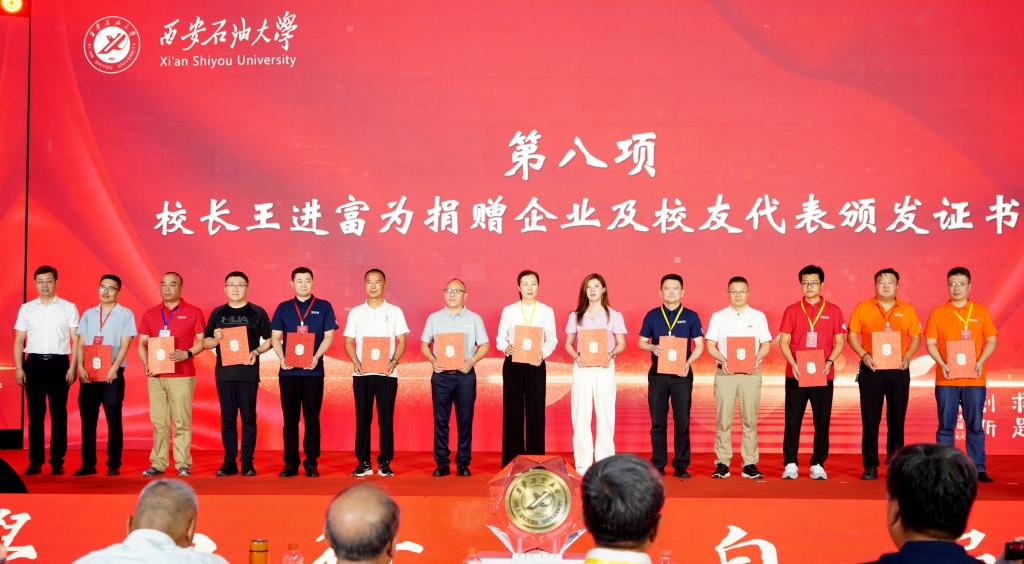 王进富为本次秩年返校活动捐款捐物的校友代表、班级代表和企业代表颁发了捐赠证书,感谢他们对学校建设和发展的贡献。