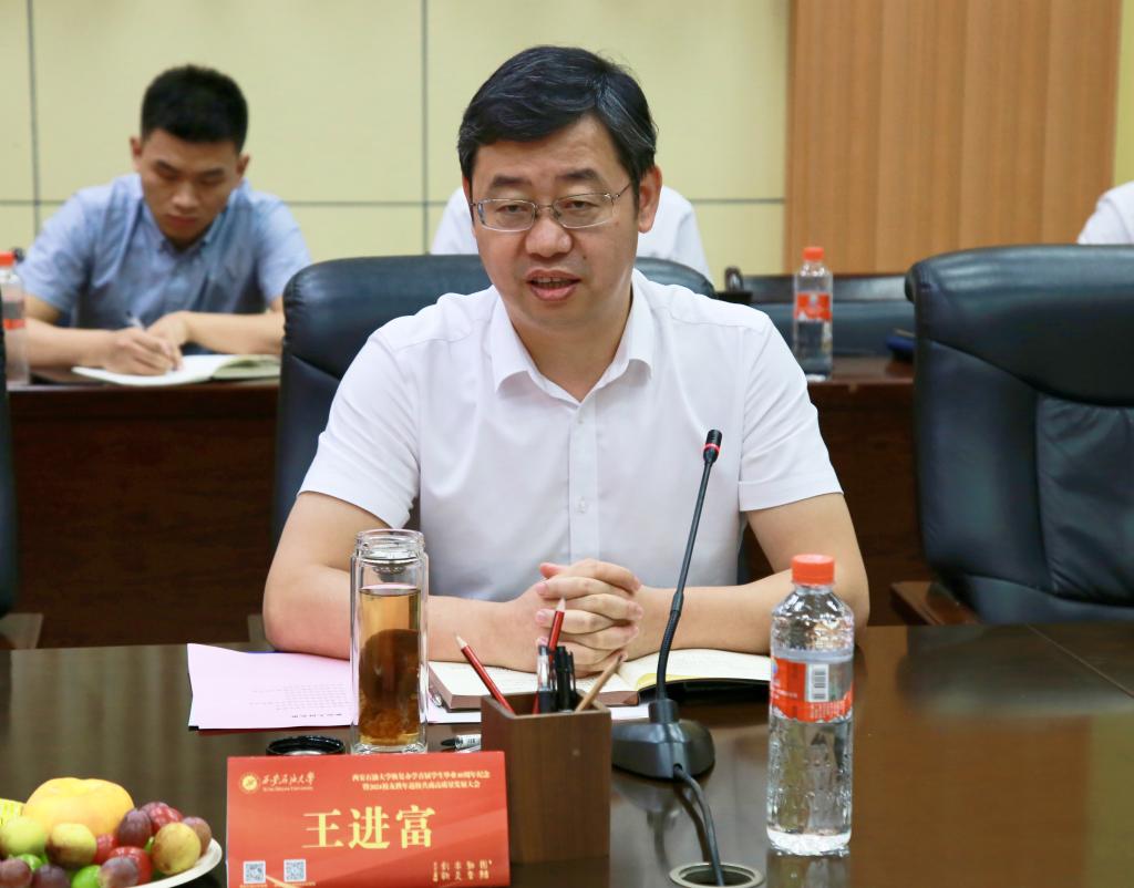 王进富表示,校友们聚焦母校未来发展提出了真切的意见和建议,字字句句都是压力和动力。他结合学校的发展现状,介绍了在人才培养、学科建设、科学研究、校企合作、就业创业、终身学习等方面采取的一系列具体举措和制度设计。他指出,母校时时刻刻牵挂着校友们,关注着校友们的每一次进步,学校定会以实际行动跑出加速度,不辜负校友们的美誉、表扬和期待。