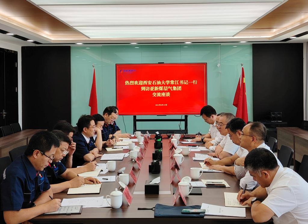 在新疆亚新煤层气集团走访期间,集团党委书记、董事长崔玉淼热情接待了常江、王进富一行。崔玉淼热烈欢迎学校领导半年内的再次正式来访,对学校高度重视与亚新煤层气开展校企合作表示高度赞赏和衷心感谢。在座谈会上,双方围绕前期在天然气、煤层气“双气共采”技术、煤炭地下气化、导向钻井工具、压裂改造技术、区域地质构图等多个合作领域的项目进展情况进行交流和探讨,并就双方共建勘探开发协同创新研究院,在基础理论和关键技术共同研究、共建企校合作团队、联合开展重大项目论证、联合攻关重大技术难题、研发重大装备、教师“沉浸式”入企、企业导师聘任等领域开展实质性合作交换了意见和建议。该集团党委委员、副总经理韦波,总地质师梁则亮,集团特级专家王一兵等企业领导参加了座谈交流。