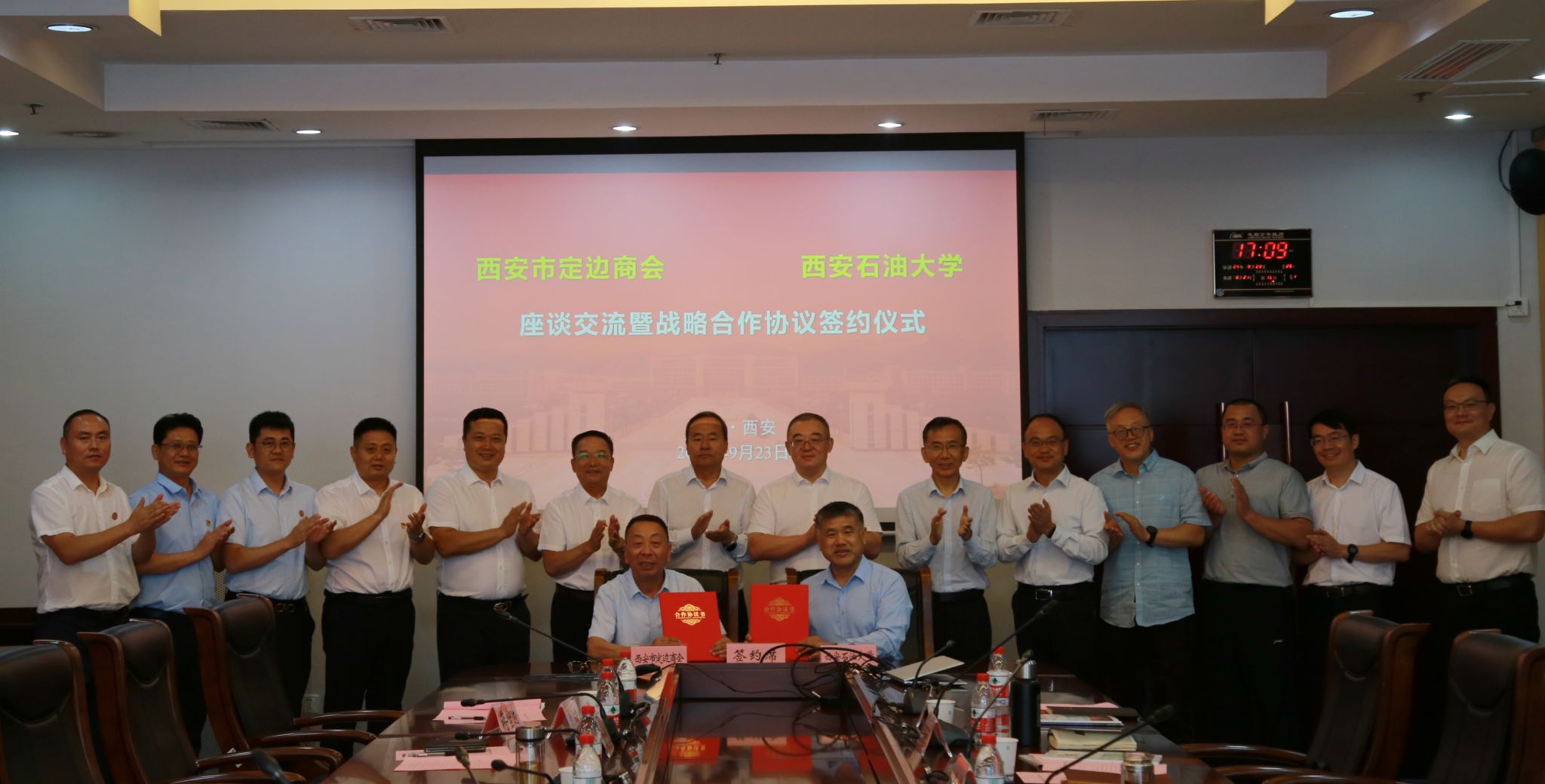 9月23日下午,beat365与西安市定边商会在鄠邑校区开展座谈交流暨战略合作框架协议签约仪式。校党委书记常江、副校长赵健,西安市定边商会会长魏云章出席会议。会议由校党委副书记张木主持。