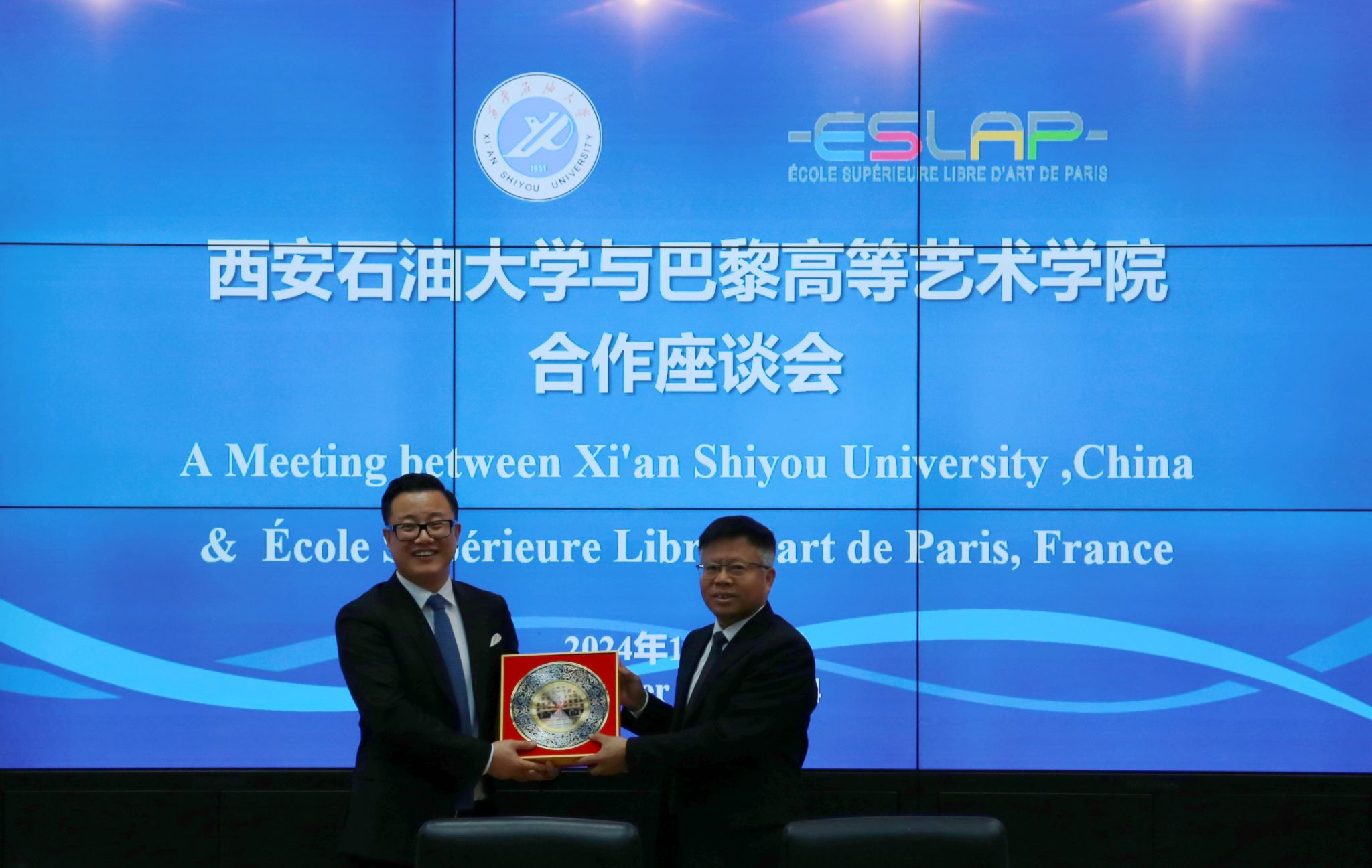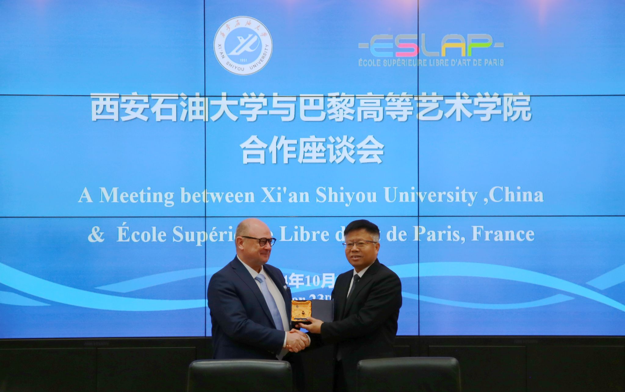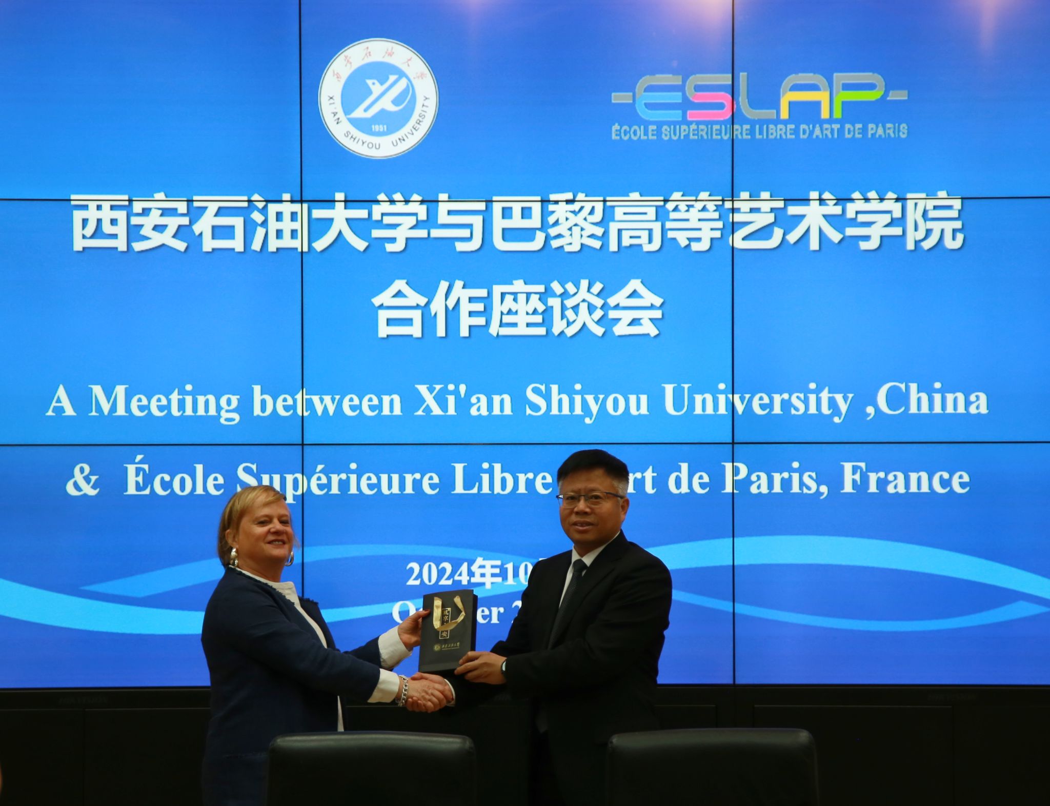 10月23日上午,法国巴黎高等艺术学院副校长CANG YUAN(藏渊)、学术委员会总顾问方所·吉博(GilbertFrancois)、国际合作中心国际关系总顾问玛丽·皮埃尔(Marie Pierre)等一行来校访问,两校合作座谈会在雁塔校区会议中心第二会议室进行,副校长张骁勇出席座谈会并致辞。