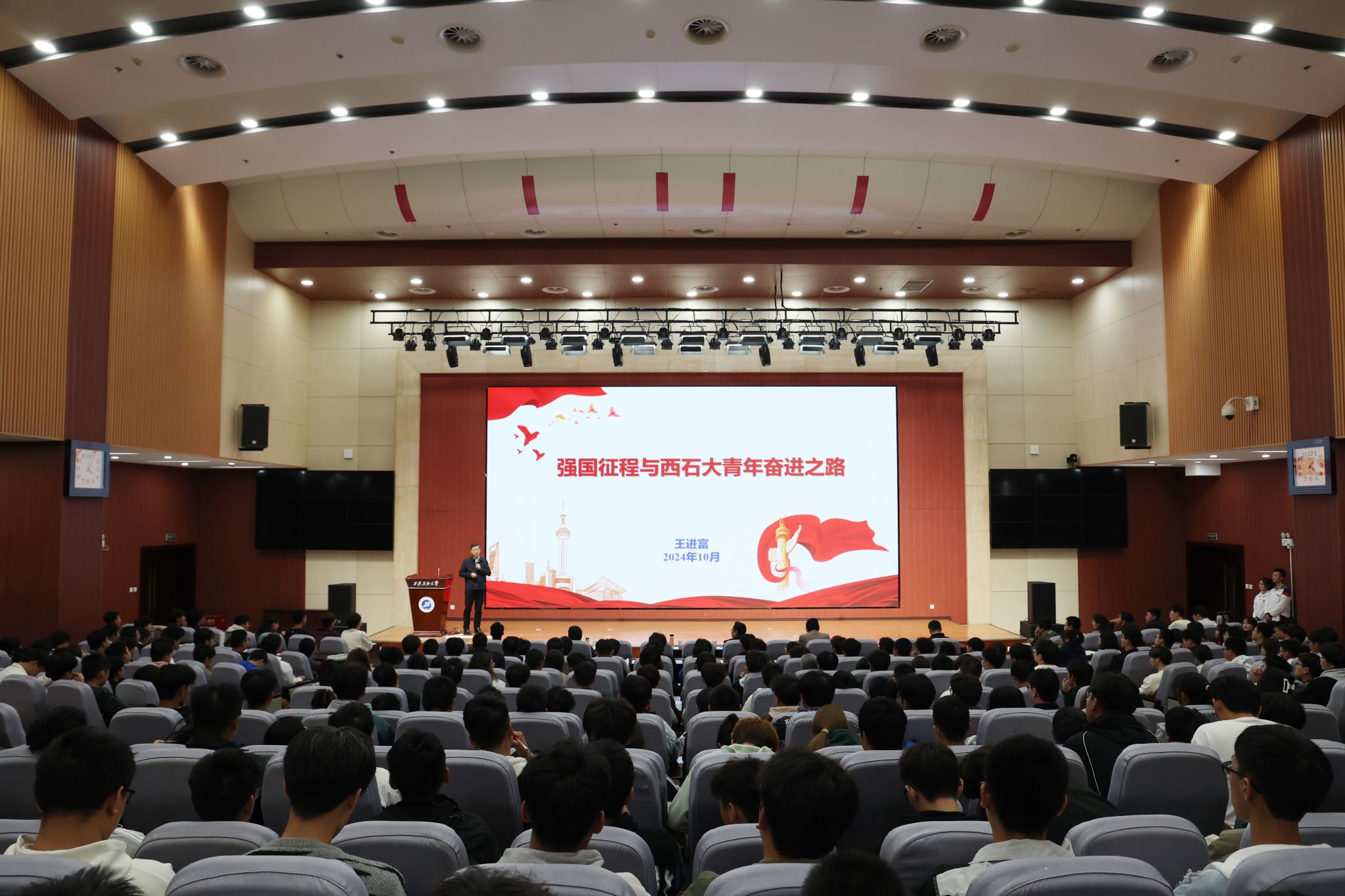 10月23日下午,校长王进富在鄠邑校区弘石报告厅为地球科学与工程学院师生讲授题为“强国征程与西石大青年奋进之路”的专题思政课。地球科学与工程学院负责人、全体学工干部及400余名学生参加。
