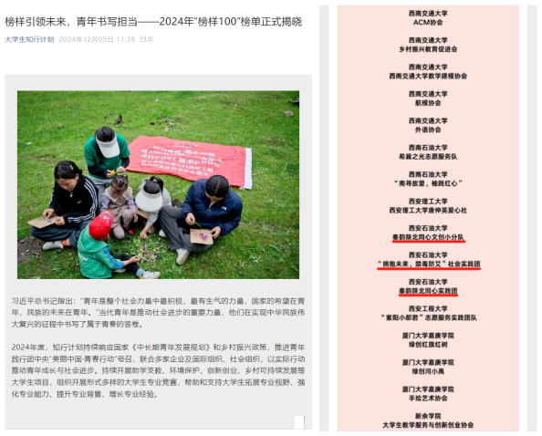 据悉,“榜样100|全国优秀大学生社团及团队征集活动”项目作为知行计划年度表彰项目,通过榜样的力量激励全国青年大学生社团/团队在实践中“受教育、长才干、做贡献”。2024年,“榜样100”吸引了来自全国286所高校的1266支团队报名,经过评选,最终806支团队脱颖而出,荣登榜单。