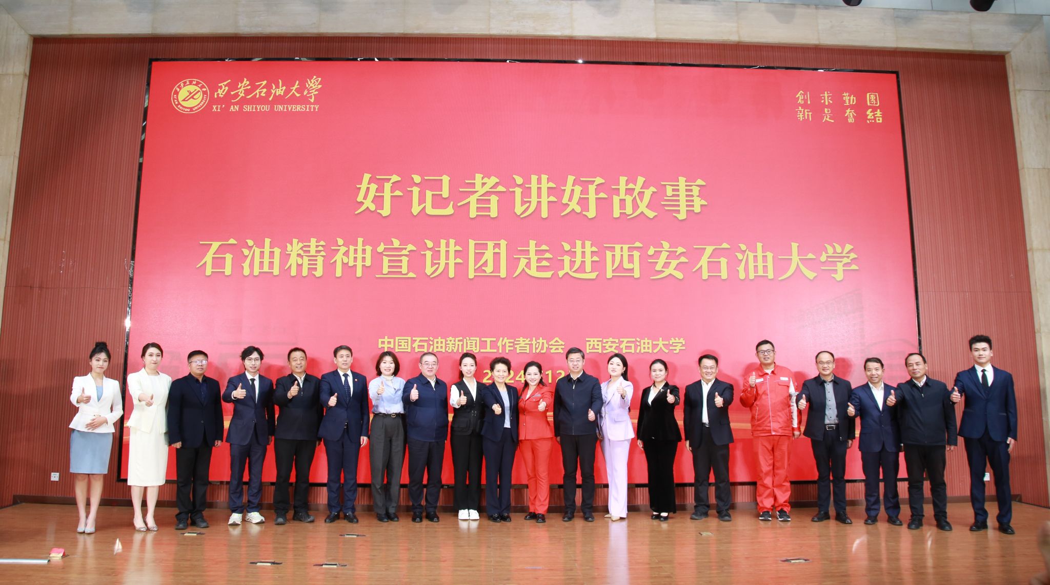 12月16日,中国石油记协“好记者讲好故事石油精神宣讲团”首场宣讲走进beat365英国官方网站。中国石油新闻工作者协会常务副主席、“好记者讲好故事石油精神宣讲团”团长杨守娟,中国石油新闻工作者协会副主席、“好记者讲好故事石油精神宣讲团”副团长耿玉锋,beat365党委书记常江、校长王进富、校党委副书记程永清,副校长张骁勇、赵健出席宣讲会。全国石油石化行业的8名记者,中国石油记协、中国石油报社、中国石化报社相关部门负责人以及学校相关部门、院系负责人、600余名师生代表分别在鄠邑校区、雁塔校区两个会场现场参加,宣讲会还通过beat365英国官方网站官微、抖音账号等对外网络直播,18.5万校友、网友等在线参加。