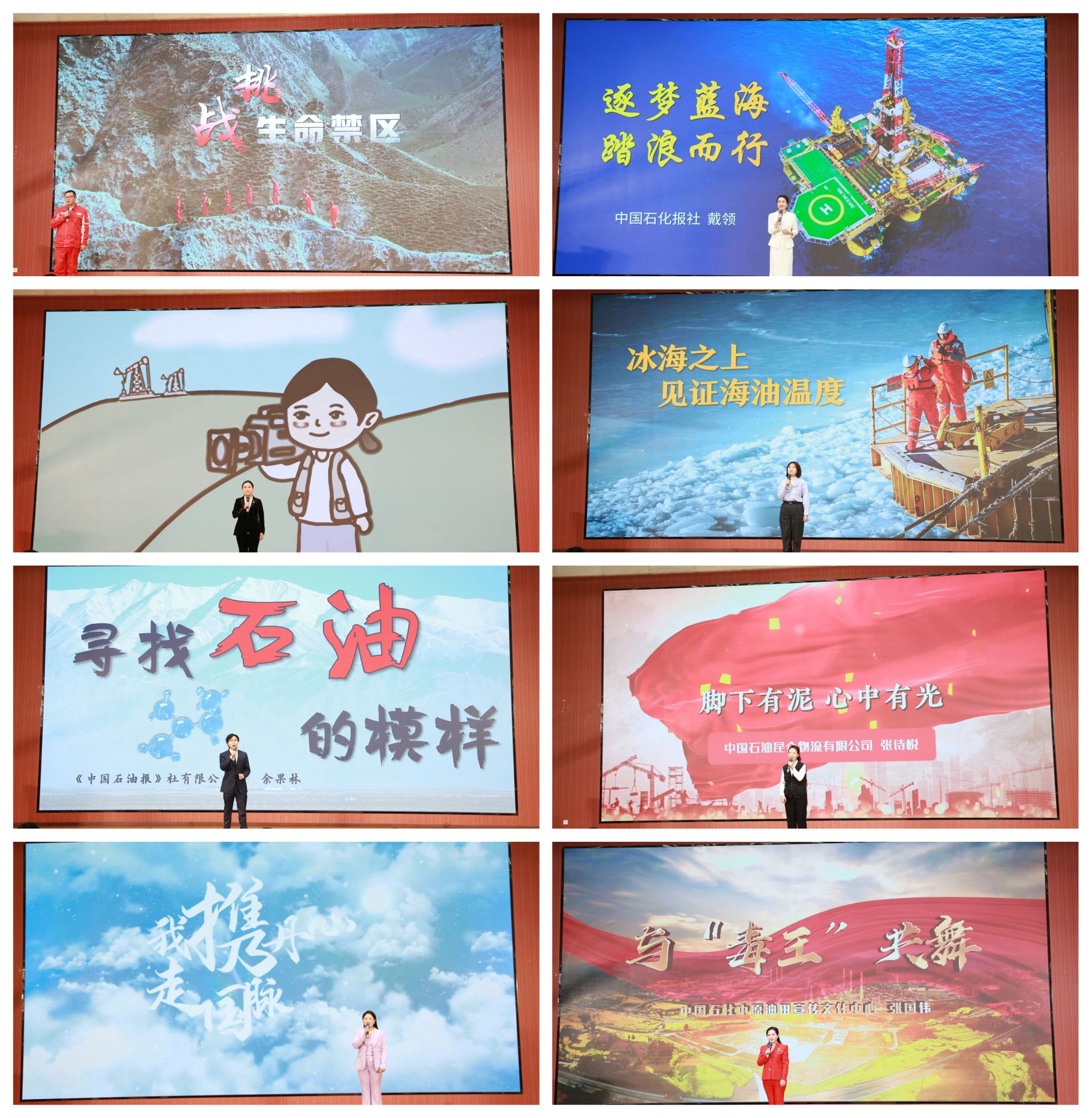 中国石油塔里木油田新闻中心记者王川、中国石化报社记者戴领、延长石油集团新闻中心记者张曦月、中国海洋石油报社记者要雪峥、中国石油报社记者余果林、中国石油昆仑物流长庆运输分公司记者张诗悦、国家管网集团北方管道新闻中心记者王琳、中国石化中原油田宣传文化中心记者张国伟等8名记者,为现场观众讲述了自己亲历的能源行业的感人奋斗故事,传递着“为祖国加油、为民族争气”的情怀担当。