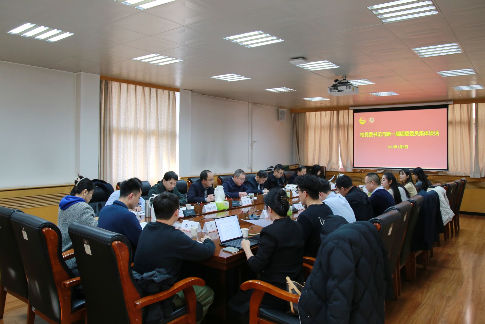 1月8日下午,校党委书记常江与新一届团委委员在雁塔校区行政楼五楼会议室集体谈话。党委副书记张木出席会议,党委办公室(校长办公室)、纪检监察机构、党委组织部、党委学生工作部、研究生工作部主要负责人参加会议,会议由副校长赵健主持。