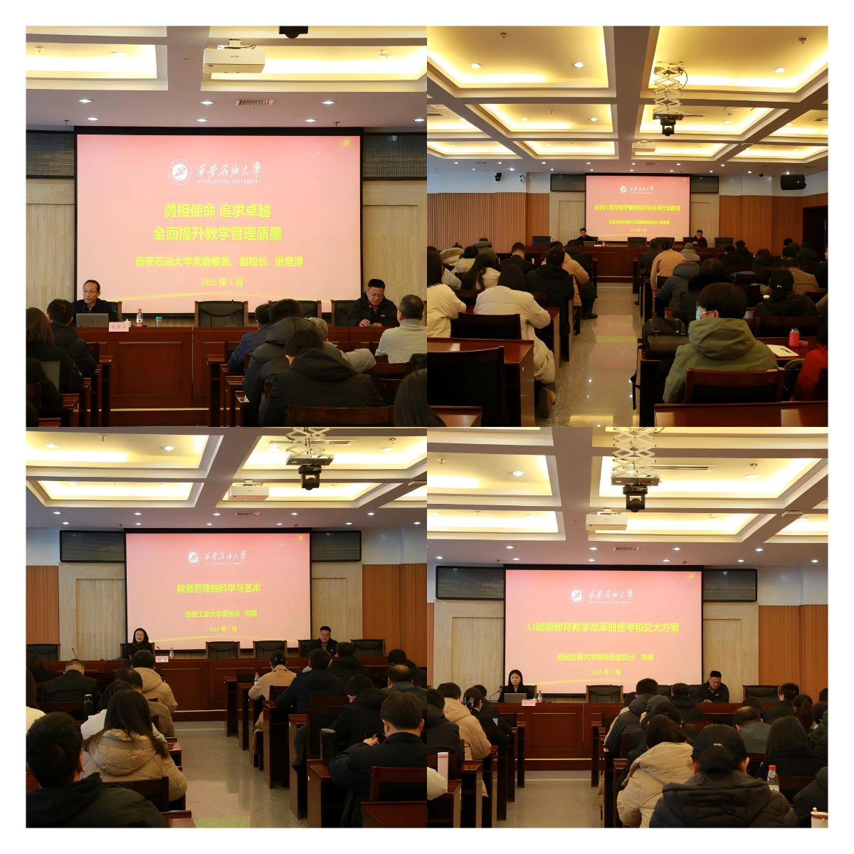 在教学系统干部专题培训中,副校长张君涛以《勇担使命追求卓越全面提升教学管理质量》为题向全体教学系统干部作专题辅导报告。报告包括高等教育教学的新形势、学校本科教学的新任务和教学管理人员的新要求等三个部分,他从实施铸魂育人行动、培养体系创新计划、专业内涵提升计划、数智赋能教学计划、科教产教融合计划、教学质量提升计划、一流师资队伍建设和教学国际化行动等八个方面系统阐述了学校本科教学的预期目标。他表示教学管理人员要发扬三种精神、强化五个意识、提升五种能力,成为教学理念创新与变革的引领者、教学秩序与质量稳定提升的保障者、教师专业成长与发展的促进者、教育资源优化与整合的推动者和学校教学质量文化与品牌的塑造者,为如何开展好学校教育教学工作提供了很好的启示和有力的指导。同时,西北农林科技大学原教务处处长陈遇春作《新时代高校教学管理的方法论与行动自觉》专题讲座,阐述了教学管理的内涵与体系,明确了教学管理者的职责定位及工作重点,对提升教学管理的整体效能提供了宝贵经验。西安工业大学副校长闫莉作《教务管理的科学与艺术》专题讲座,阐释了教务管理科学性与艺术性的意义,讲解了教务管理的科学依据与实践方案,结合实际案例分享了西安工业大学教学管理的具体举措及工作思考,引导教学系统干部创新理念、科学规划、精准施策,为优化教育教学工作提供了行之有效的管理思路和举措。西安交通大学教务处副处长李涓作《AI赋能教育教学改革的思考和交大方案》专题讲座,分析了国内外高校人工智能赋能教育的背景与趋势,结合交大实际系统讲授了AI+专业、AI+课程、AI+教学、AI+学习、AI+评价、AI+资源、AI+平台等七个方面的交大方案与实践,分享了对AI赋能教育教学改革的思考,展望了智慧教学的未来。