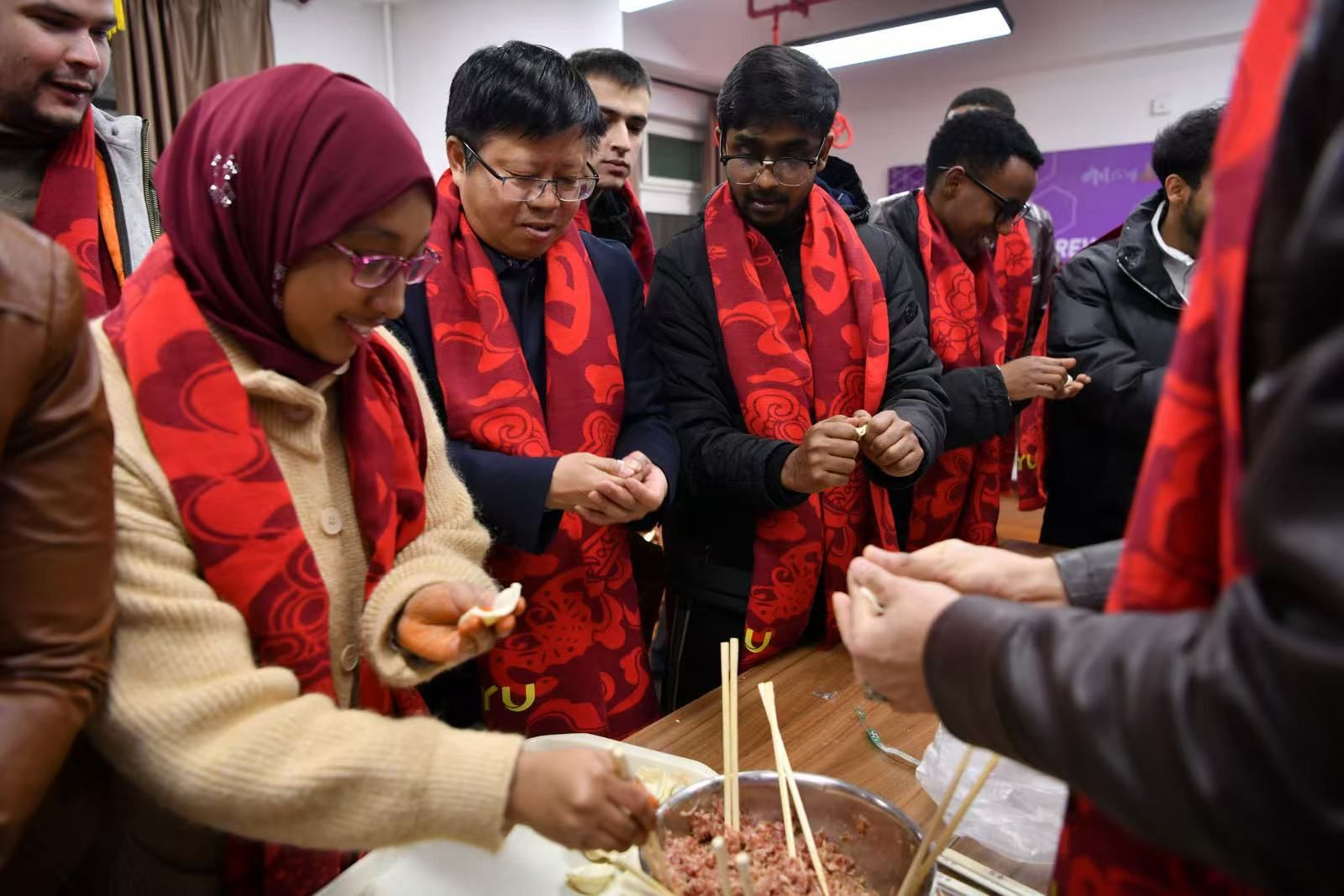慰问期间,张骁勇与国际学生们一道实践,亲自示范包饺子的方法和蛇形剪纸技巧。大家围坐在一起,欢声笑语不断,共同庆祝农历新年的到来。