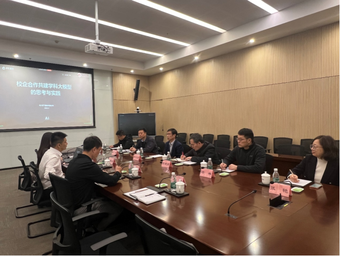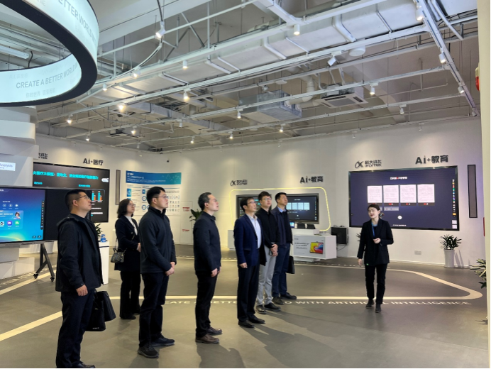 在科大讯飞丝路总部,苏文甫一行首先参观了人工智能展厅,深入了解了科大讯飞自创立以来的发展历程,包括其在AI+教育、AI+产教融合、AI+听见、AI+医疗、AI+城市、AI+智能服务等多个领域的产品研发现状。随后,双方围绕校企合作模式、人工智能学科大模型开发、人才培养及毕业生就业渠道等议题展开了深入交流。