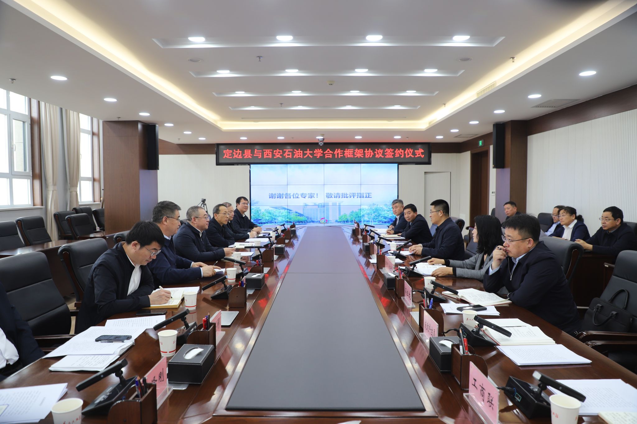 5月9日常江书记一行来到定边县,出席了校地合作协议签署仪式暨座谈会,定边县委书记姬世平,县委常委、副县长党玉飞,以及定边县各相关职能部门及县域所辖部分企业负责人参加了签约仪式和座谈会,会议由县委常委、宣传部部长刘云霞主持。