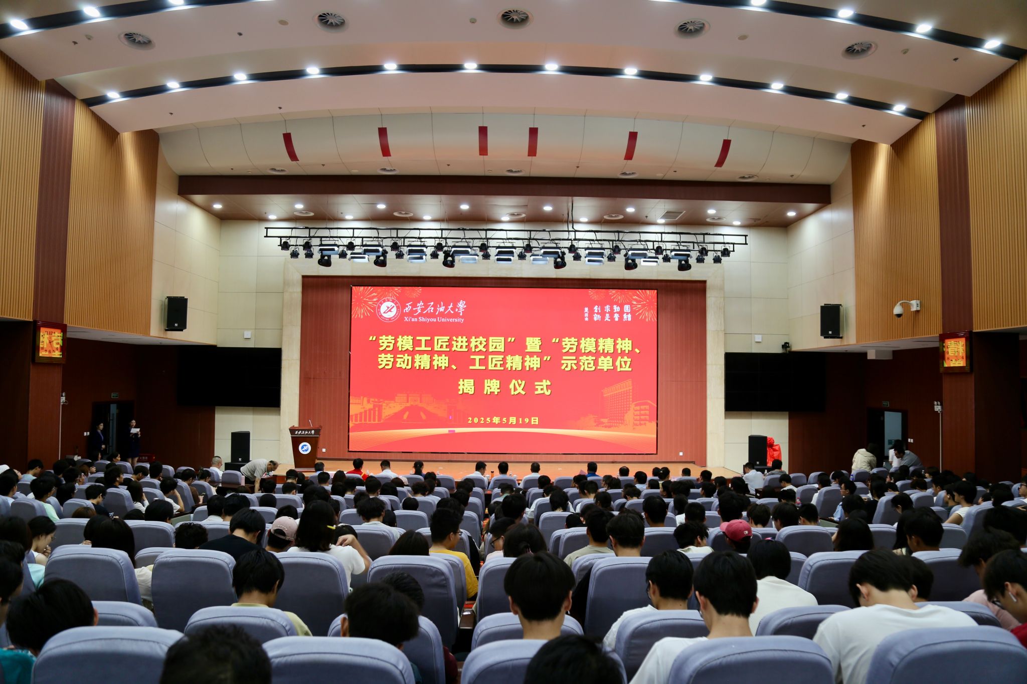 揭牌仪式结束后,“劳模工匠进校园”现场报告会热烈举行。全国“五一”劳动奖章获得者薛涛和全国劳动模范张发珠分别做了题为《延长油田精细注水开发实践与认识》和《“土发明家”的创新实践》的专题报告,用他们的亲身经历生动讲述了油田人在产业报国和能源强国征途上“埋头苦干、不怕困难”,“择一事、终一生、干一行、专一行”,将青春和热血熔铸在陕北高原的奋斗故事,用平凡的坚守创造了属于自己的精彩人生。
