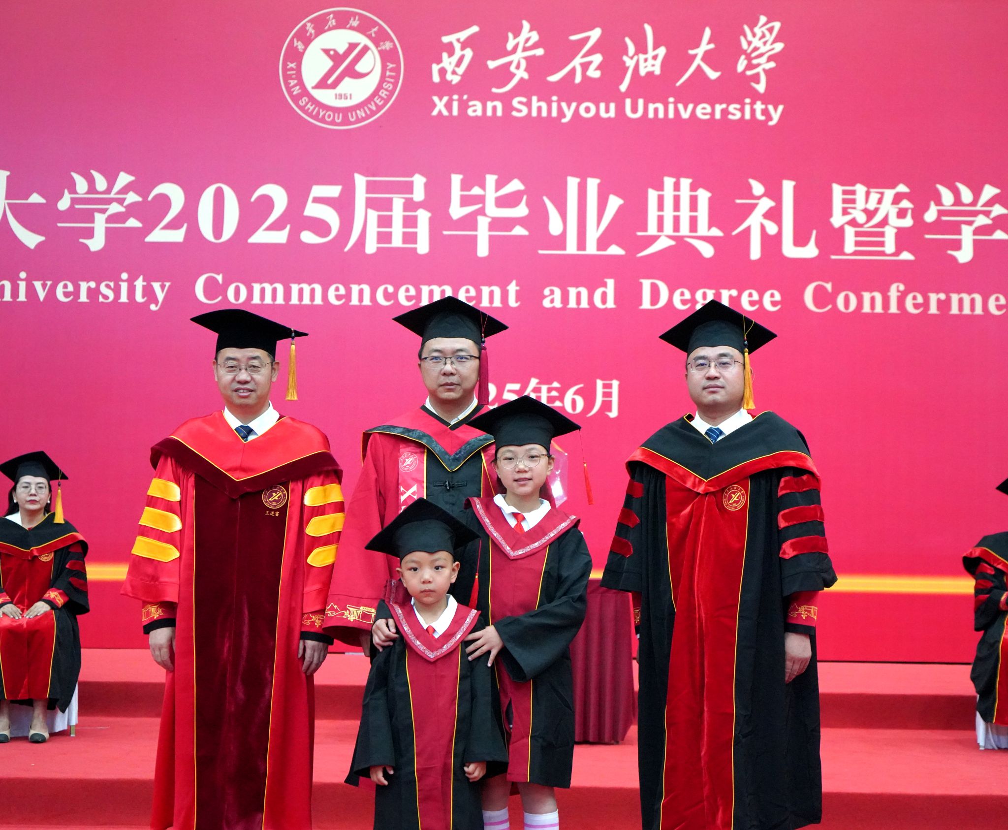 王进富校长在校学位评定委员会委员的见证下为到场的本科、硕士和博士毕业生逐一拨穗、授予学位,并合影留念。