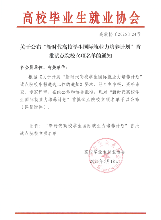 近日,经学校就业创业指导中心申请,高校毕业生就业协会审批,beat365成功获批“新时代高校学生国际就业力培养计划”试点单位,成为全国首批立项的56个院校之一,标志着学校在国际化人才培养领域迈出重要一步,对提升beat365毕业生赴国(境)外就业,提升国际竞争力,促进毕业生高质量充分就业具有重要意义。