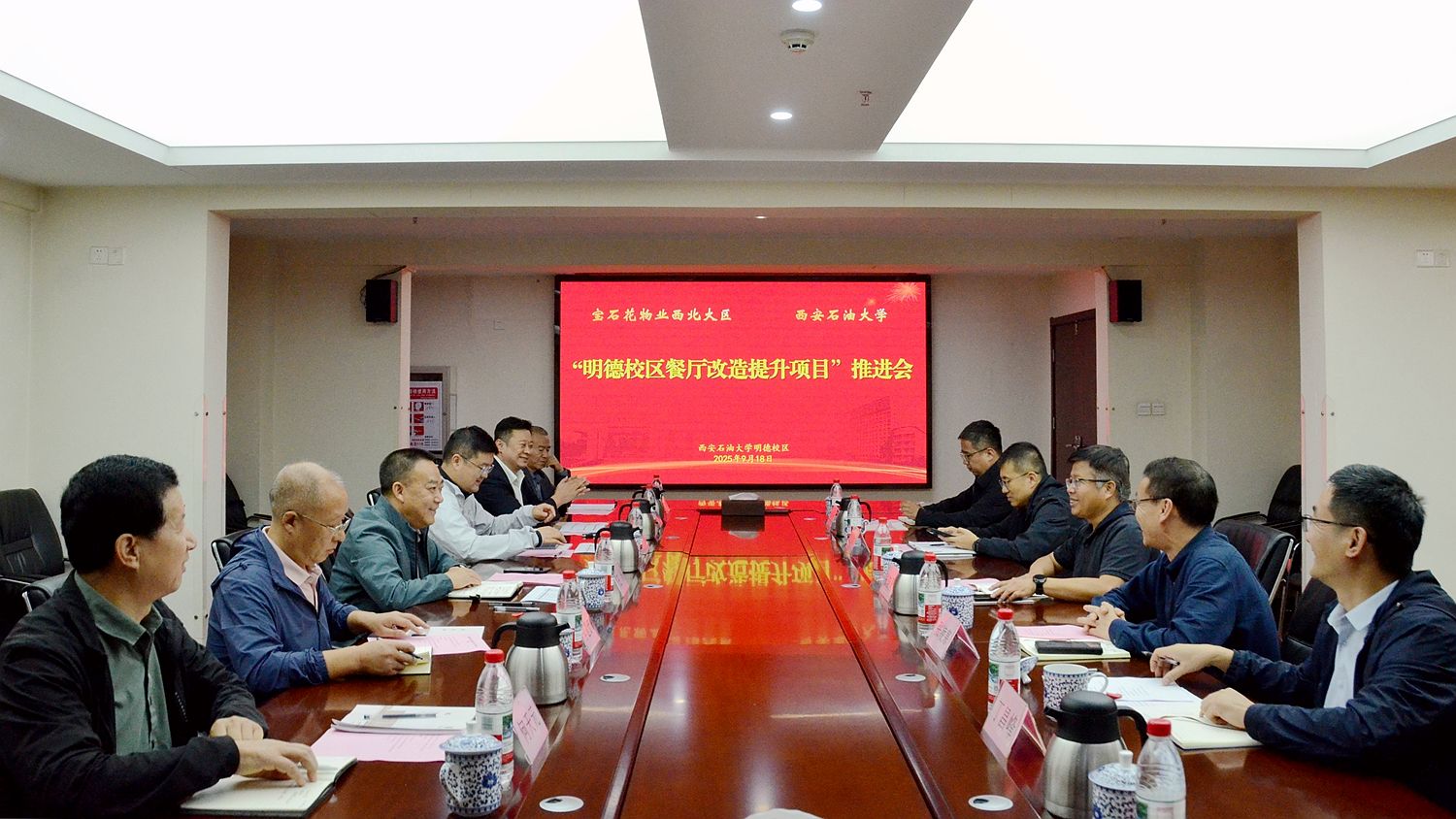 9月18日下午,“明德校区餐厅改造提升项目”推进会在明德校区培训中心北楼第一会议室召开。宝石花物业西北大区市场总经理王泳、副校长张骁勇出席会议,会议由继续教育学院党总支书记张凌寒主持。宝石花物业西北大区、后勤处、国际教育学院相关负责人参会。