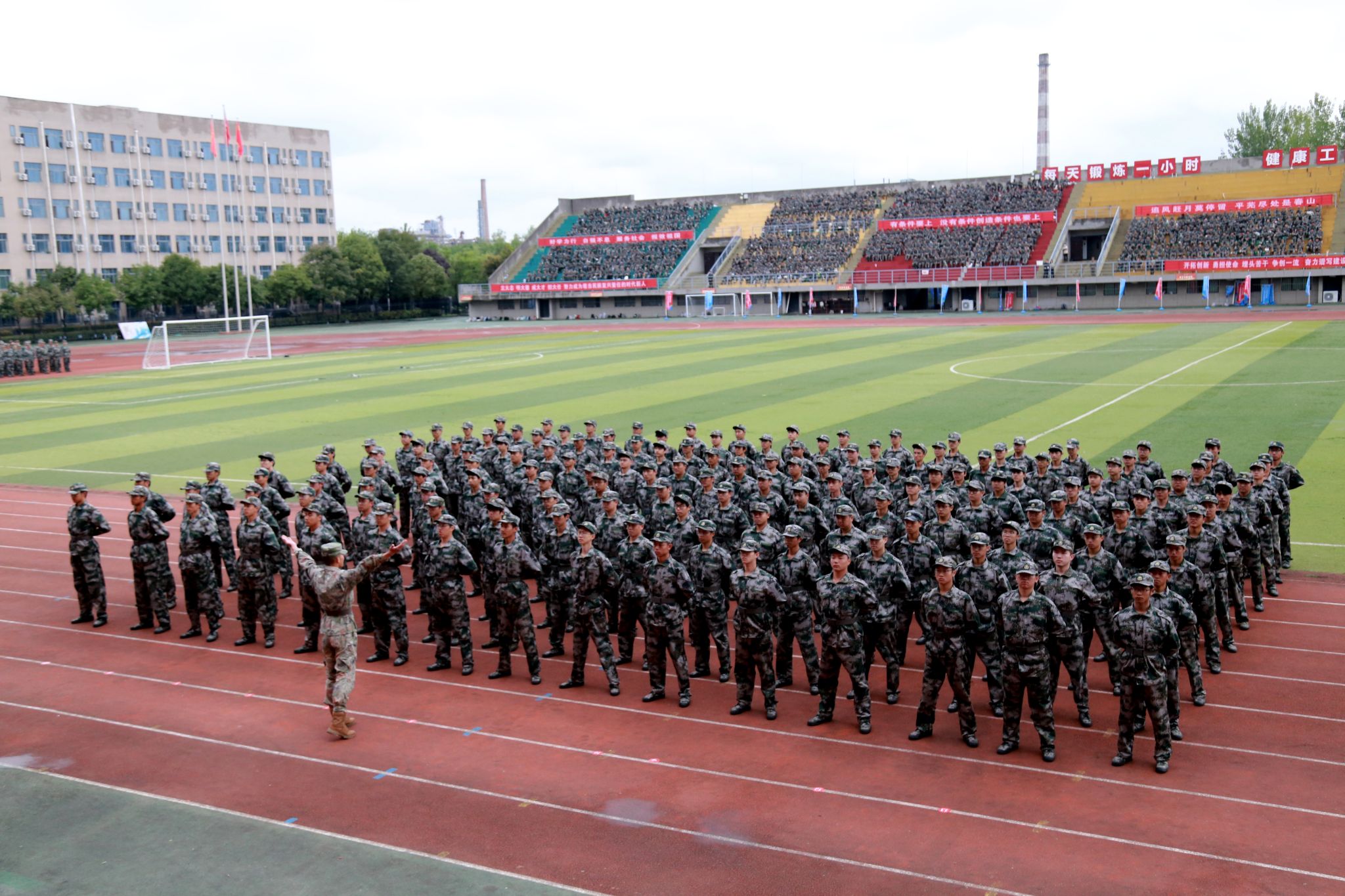 军训总结表彰大会在全体师生齐唱校歌《辉煌明天》的豪迈旋律中圆满落幕。