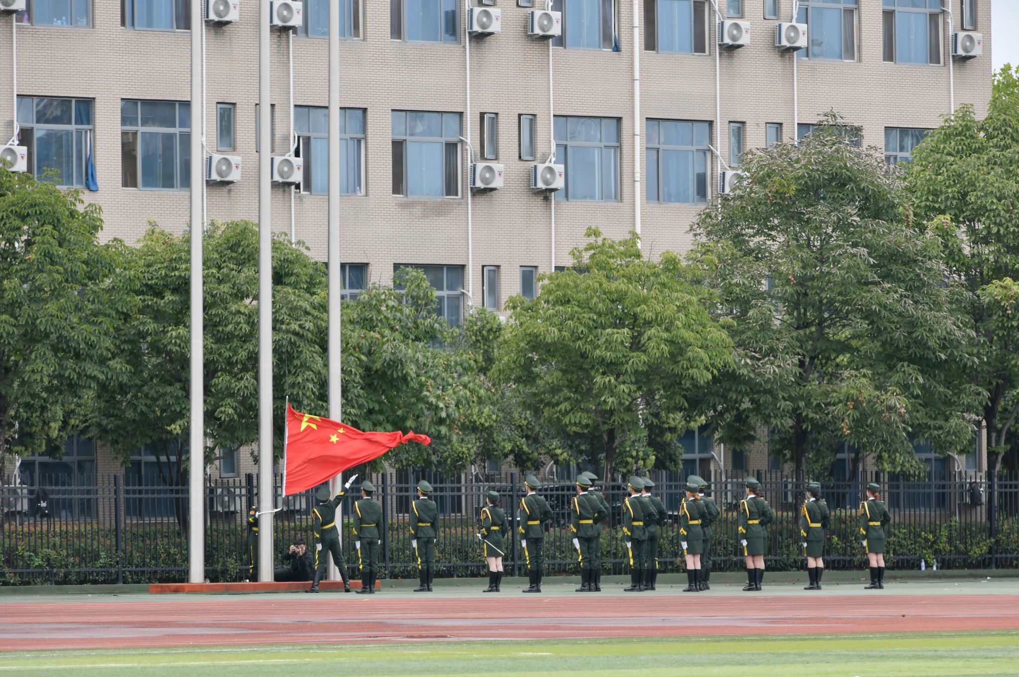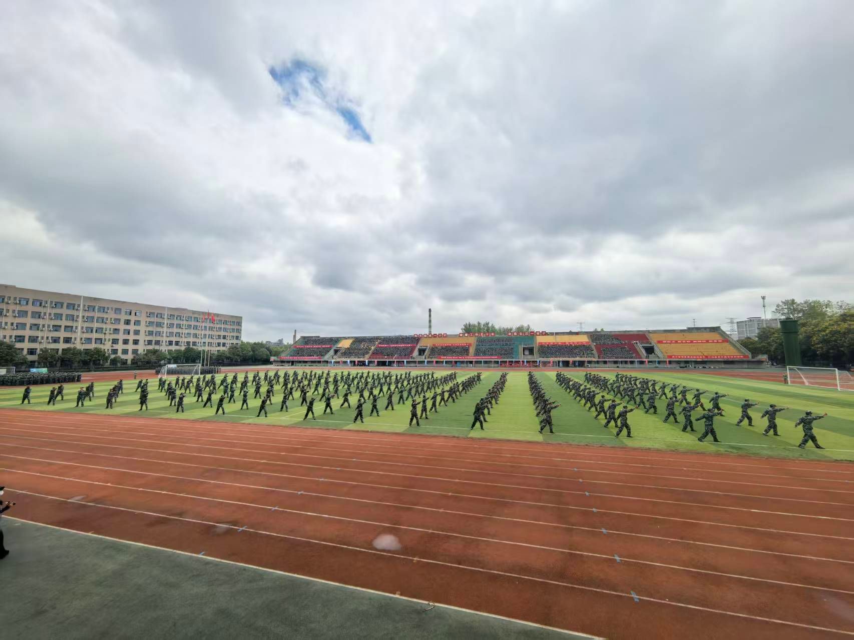 大会在庄严的升国旗仪式中拉开帷幕。国旗护卫队踢着铿锵的步伐,每一声踏地都犹如惊雷叩击青春热血;鲜艳的五星红旗冉冉升起,激昂的国歌声响彻校园,在场师生、教官庄严肃立,向国旗行注目礼。
