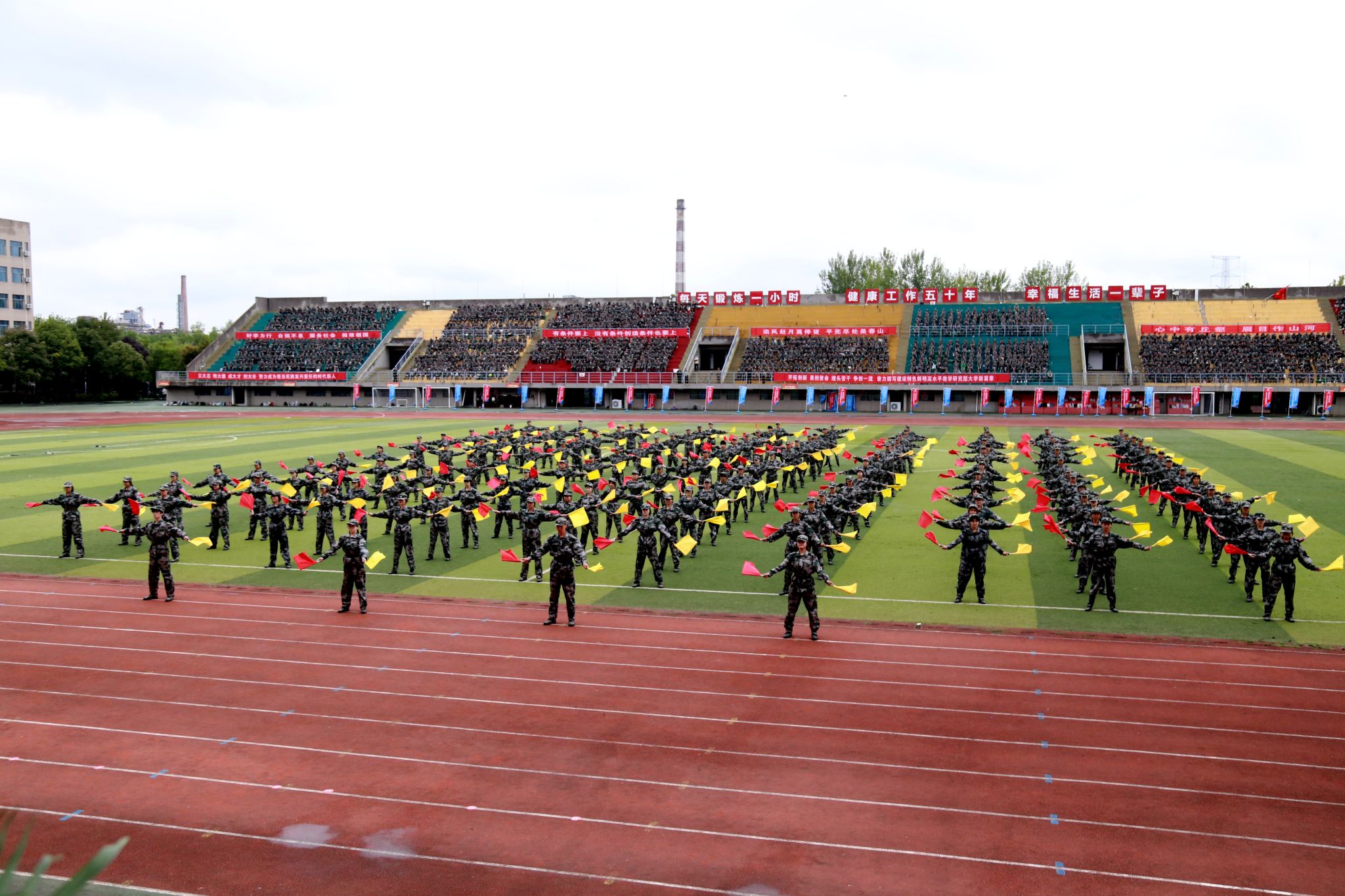 手旗方阵----同学们以整齐划一的动作变换出各种造型。每一次旗语的精准传递,都是对团队默契的最好诠释。