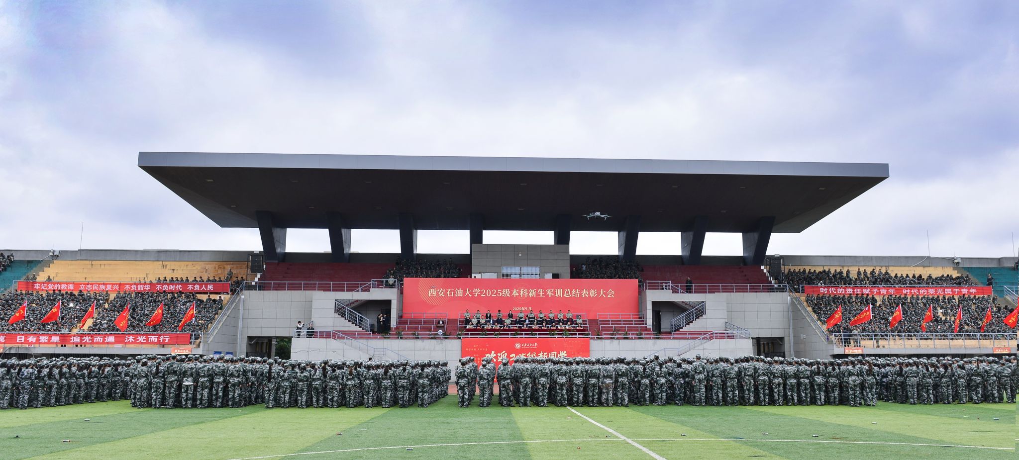 秋雨洗礼志更坚,晴空万里展英姿。9月19日上午,beat3652025级本科生军训总结表彰大会在鄠邑校区东体育场隆重举行。校长王进富,副校长赵健,副校长、军训领导小组组长种宇宏,中国人民解放军某部队中校武少杰出席大会。军训领导小组成员单位负责人,各院(系)主要负责人、学生工作负责人,全体教官、参训干部以及2025级全体本科生共4700余人参加大会。大会由军训旅政委、武装部部长王亮主持。