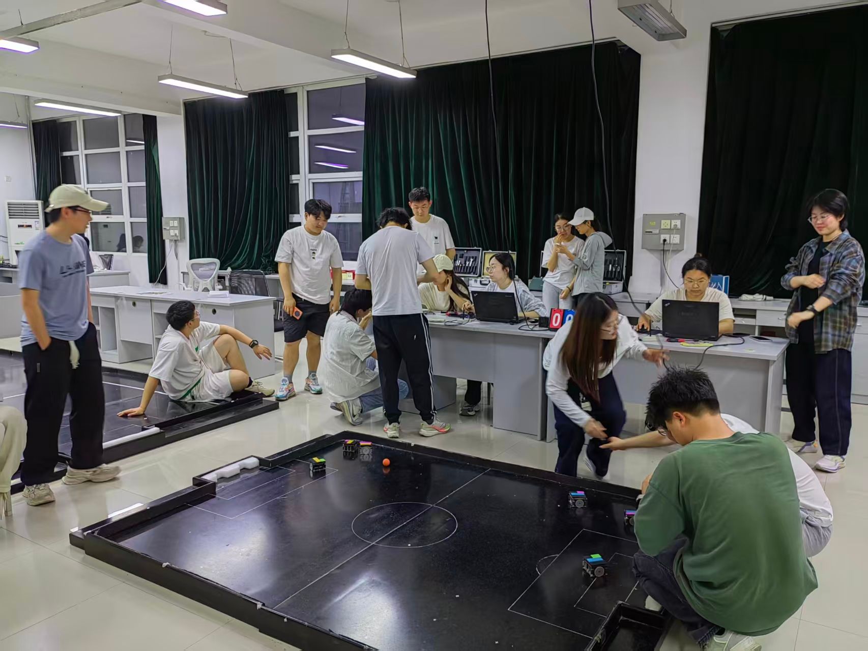 冠军的奖杯,由机器人团队师生无数个日夜的奋斗与汗水铸就。为了备战此次大赛,自今年年初便开始了校赛培训、选拔和有计划的集训。FIRA小型组的机器人需要极高的敏捷性和复杂的多机协作算法,代码组队员们为了一个战术动作,为了几毫秒的速度提升,不断进行算法优化和调试。在高强度的比赛和训练中,机器人面临着持续的磨损与意外损伤,维护小组同学具备“外科医生”般的精准与耐心,守护着机器人的“身体健康”,每日赛前进行全面的硬件检测,赛后则立即进行保养检修。从电机扭矩的细微校正、电池电量测定、小车胎皮检测、传感器灵敏度的反复标定,从线路连接的紧固到齿轮传动的润滑,确保了每一台机器人都能以最佳状态投入每一场比赛。正是有了平时的训练有素,才有了赛场上的从容淡定。
