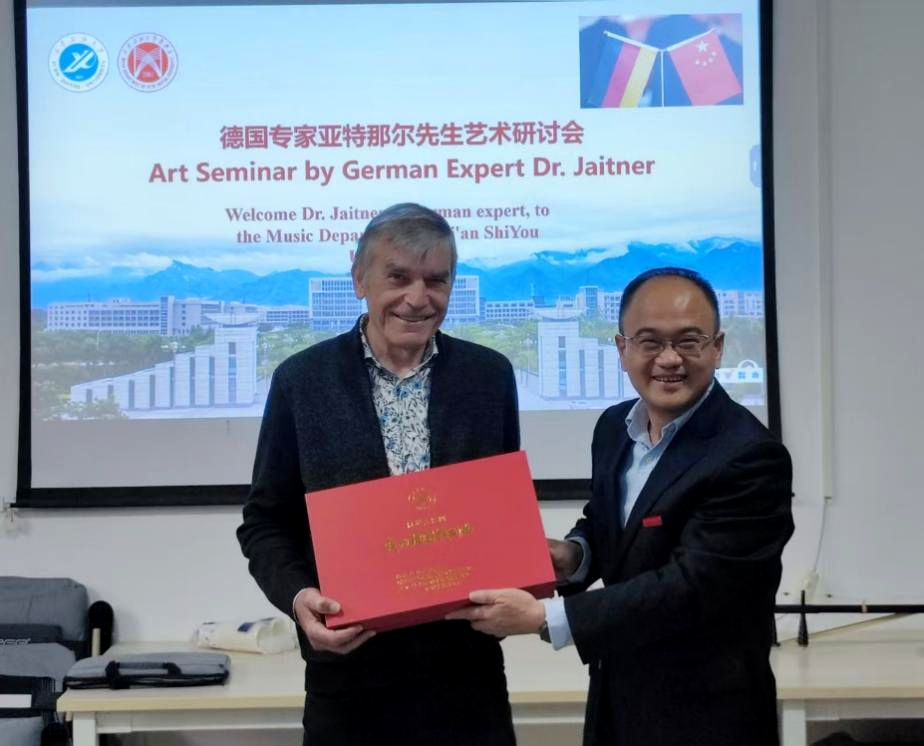 在专业交流环节,双方围绕艺术创新与国际合作展开深入对话。师生与Jaitner先生就传统音乐传承、音乐剧创作、爵士乐发展等核心议题进行了专业探讨。Jaitner先生结合国际视野提出建设性见解,为师生拓展了创作思路。会议还重点介绍了beat365原创音乐剧《我为祖国找石油》,呈现音乐系在红色题材艺术创作方面的探索成果。针对师生关注的德国留学与学术交流事宜,Jaitner先生详细介绍了德国相关教育资源与文化环境,为有意赴德深造的师生提供了实用参考。