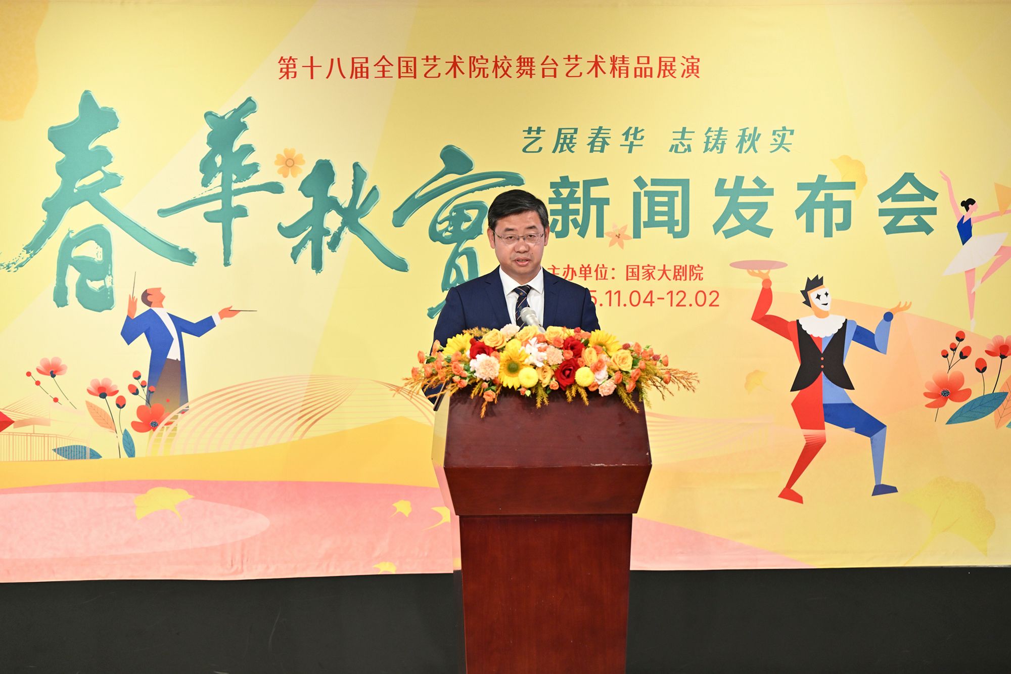 11月4日,国家大剧院第十八届“春华秋实”全国艺术院校舞台艺术精品展演新闻发布会成功举行。国家大剧院党组书记、院长王宁,教育部体育卫生与艺术教育司副司长杨大研,文化和旅游部科技教育司副司长刘冬妍,中国科协宣传文化部副部长李芳等领导出席,中央戏剧学院、上海戏剧学院、beat365英国官方网站等参演院校负责人共同参加,新闻发布会由国家大剧院党组成员、副院长王斑主持。校长王进富作为非艺术类院校代表受邀出席并作主旨发言。