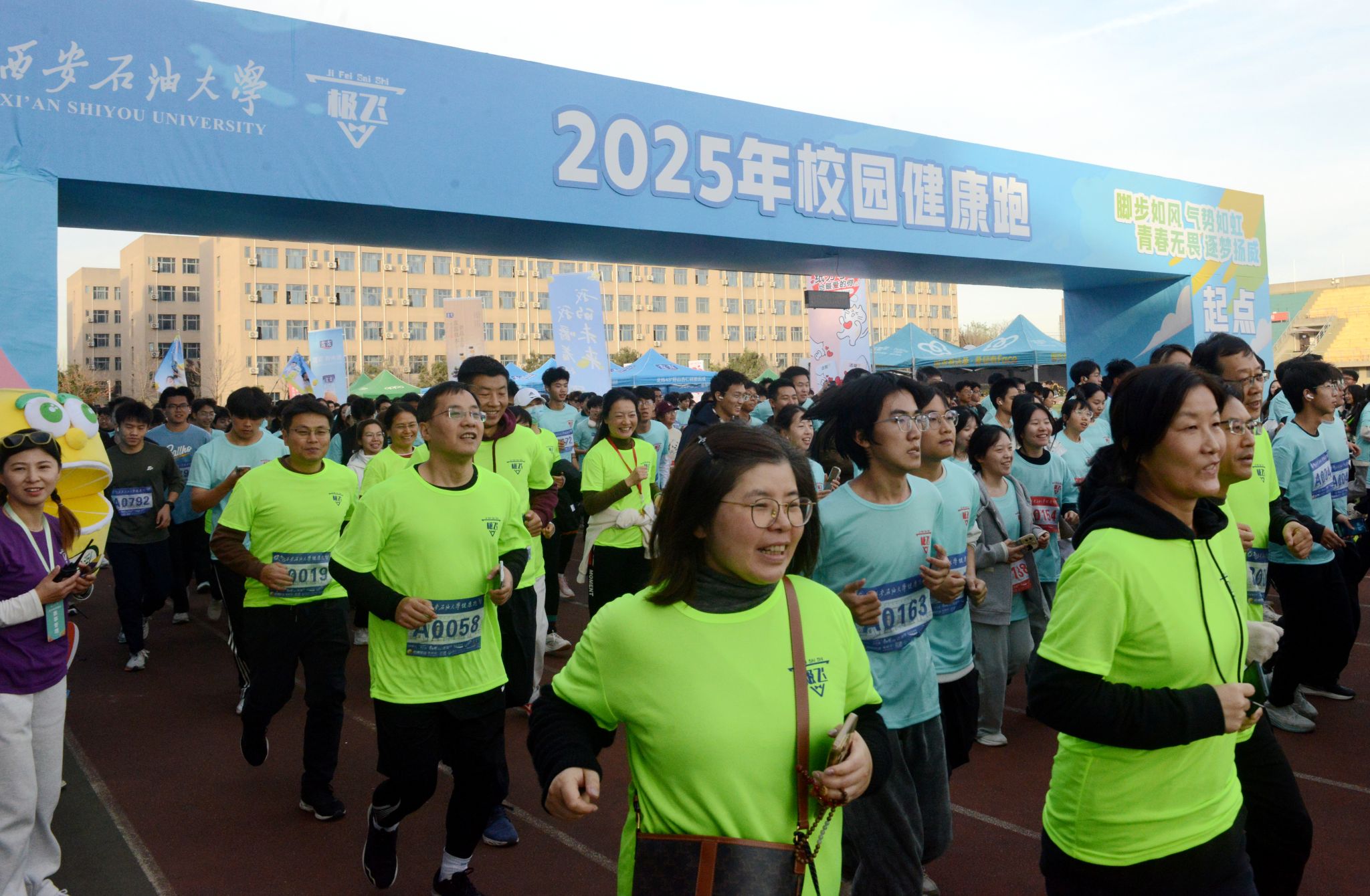 11月19日下午,beat365鄠邑校区东田径场上洋溢着一片蓬勃朝气。一千四百余名师生齐聚一堂,共同参加2025年校园健康跑活动。这场由校体育运动委员会主办,体育学院、教育部油缘成长综合素质训练基地、极飞赛事承办,宣传部、学生工作部、保卫部、校工会、团委、校医院、各院(系)协办的活动,不仅是一场体育赛事,更是学校“以体育人”、建设“幸福西石大”理念的生动实践。