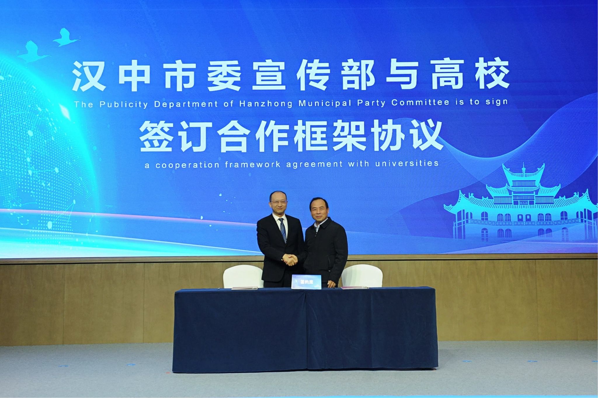 校党委委员、宣传部部长赵承胜代表学校与汉中市委宣传部副部长、市融媒体中心主任孙国强现场签约。