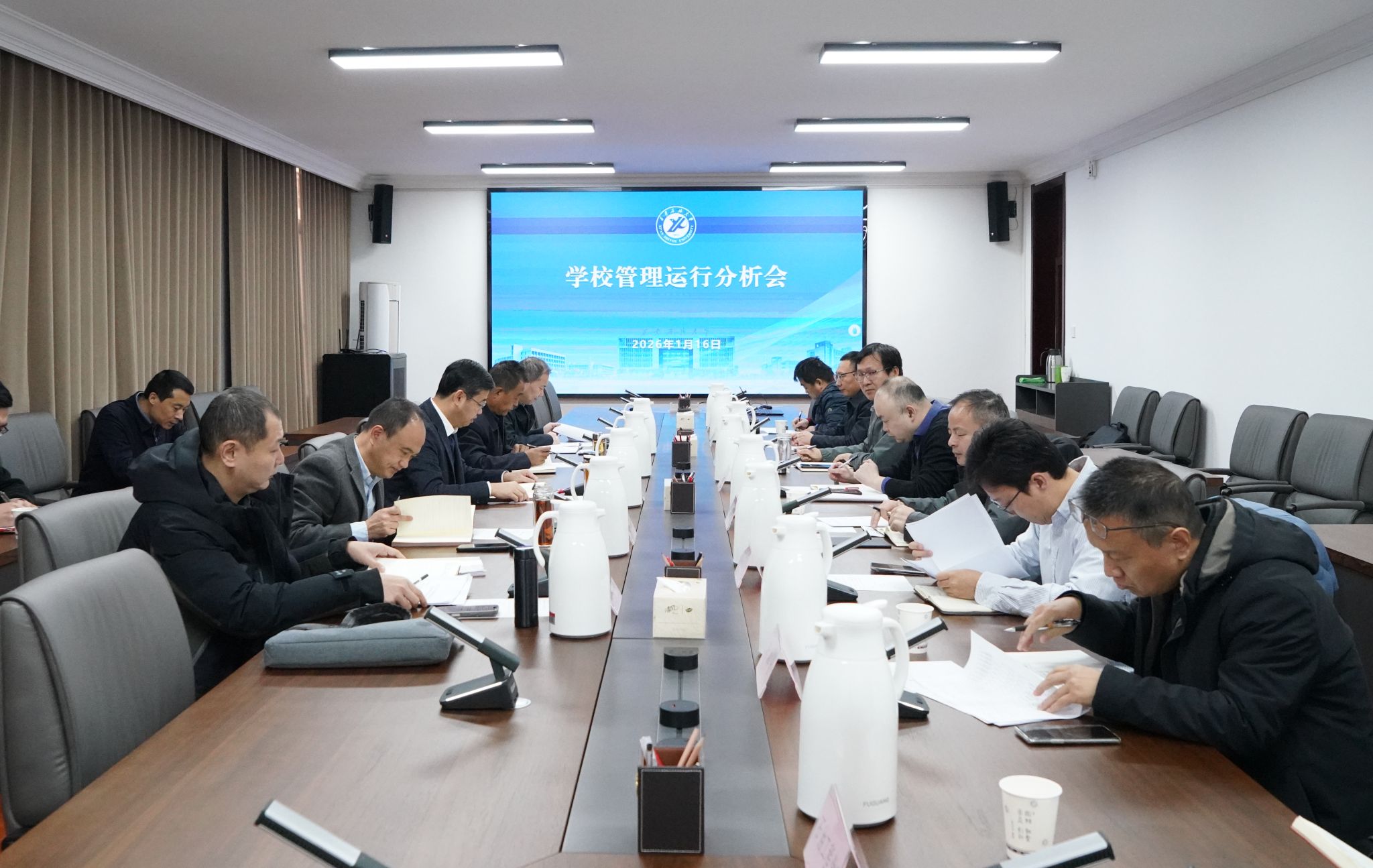 1月16日上午,学校在鄠邑校区第三会议室召开管理运行分析会,全面梳理现有制度体系与实际运行状况,深入分析突出问题,科学谋划2026年改革创新工作。校长王进富主持会议并讲话,校党委副书记程永清、副校长赵健出席会议。