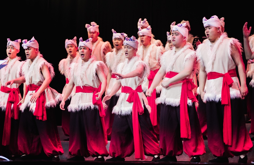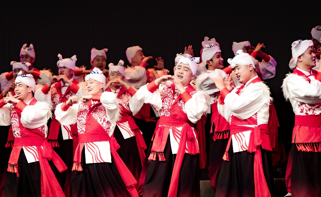 演出现场,合唱团成员身着羊肚子手巾、红腰带等陕北特色服饰,一改传统合唱的静态呈现模式,创新将秧歌步伐、陕北民间舞蹈的灵动韵律与合唱表演深度融合,一登台便让浓郁的黄土高原风情扑面而来。从雄浑激昂的《黄河船夫曲》,到缠绵深情的《走西口》,从苍凉厚重的《祈雨调》到诙谐生动的《黄土地酒曲》,一首首经专业编创的经典陕北民歌轮番唱响,成为连接历史与当下、土地与人心的文化纽带。演出尾声,《海阔天空》《立春》《路边的野花不要采》三首返场曲目将氛围推向极致,台上台下齐声合唱,歌声与掌声交织,成为春日里最动人的文化回响。