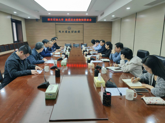 在陕西省历史博物馆,苏文甫一行实地参观了馆内陈列展览,并与馆长庞雅妮、副馆长张岩及相关部门负责人座谈交流。苏文甫详细介绍了学校办学特色、学科发展布局及人才培养总体情况,全面展示了学校在专业建设、实践育人与社会服务等方面取得的成效。外国语学院副院长陈武结合外语专业建设与人才培养实际,表达了深化校馆合作的积极意愿,希望依托陕历博丰富的文物资源与文化传播平台,拓展外语专业学生实践教学阵地,着力提升学生跨文化传播能力、涉外讲解水平与文化外宣素养,推动专业教育与中华优秀传统文化传播深度融合。庞雅妮介绍了陕历博的馆藏资源、公共服务及社会教育工作,分享了与西北工业大学等高校开展“历史进校园”等品牌活动的经验。社会教育部主任许晨详细介绍了大学生志愿者、大学生讲解员及国际志愿者实践项目。