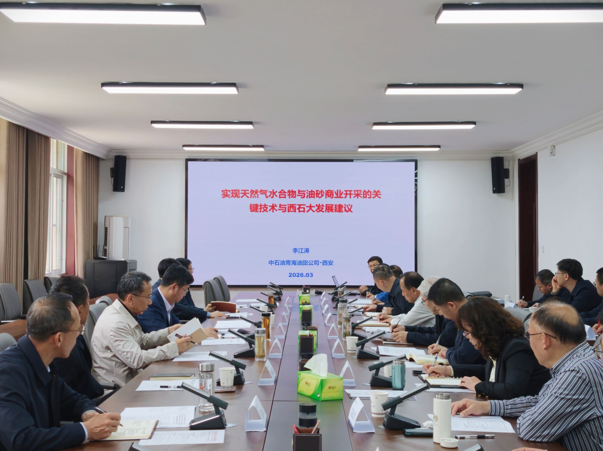 会上,李江涛以《实现天然气水合物与油砂商业开采的关键技术与西石大发展建议》为题作专题报告。报告立足国家能源战略,系统梳理了冻土带可燃冰、地表油砂开采的技术挑战与创新路径,结合青海油田实践,提出了天然气水合物开采的借鉴思路并对油砂开采技术进行了展望。围绕学校发展,李江涛提出了深耕油气、布局储能与稀土、发展能源人工智能、发挥欧亚陆港区位优势、建设能源储换节研发基地等五条战略建议,并对学校学科发展及重点实验室建设提出了建设性意见。整场报告既有宏观视野下的技术展望,又有贴近实际的学科发展思考,饱含对母校的深厚情感与殷切期望,对学校进一步明确科研方向、强化特色优势、服务国家能源安全具有重要指导意义。